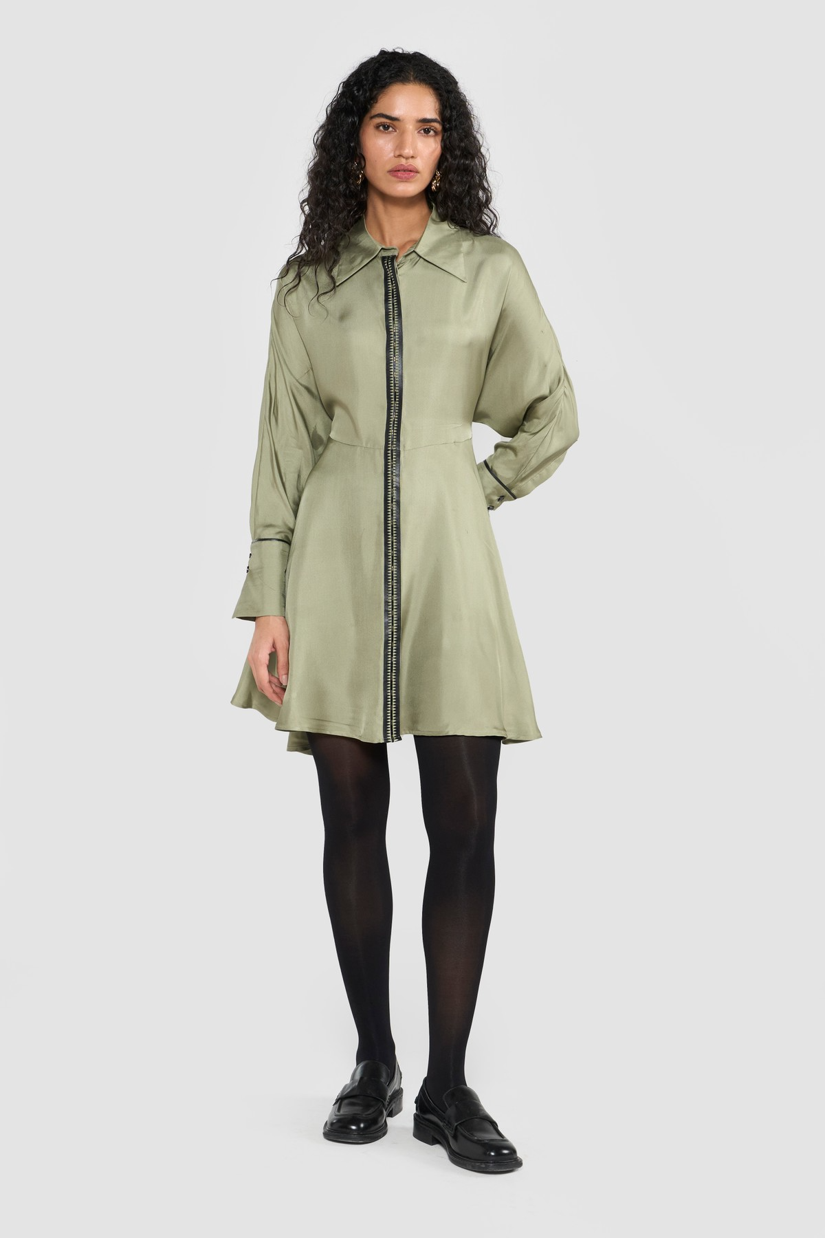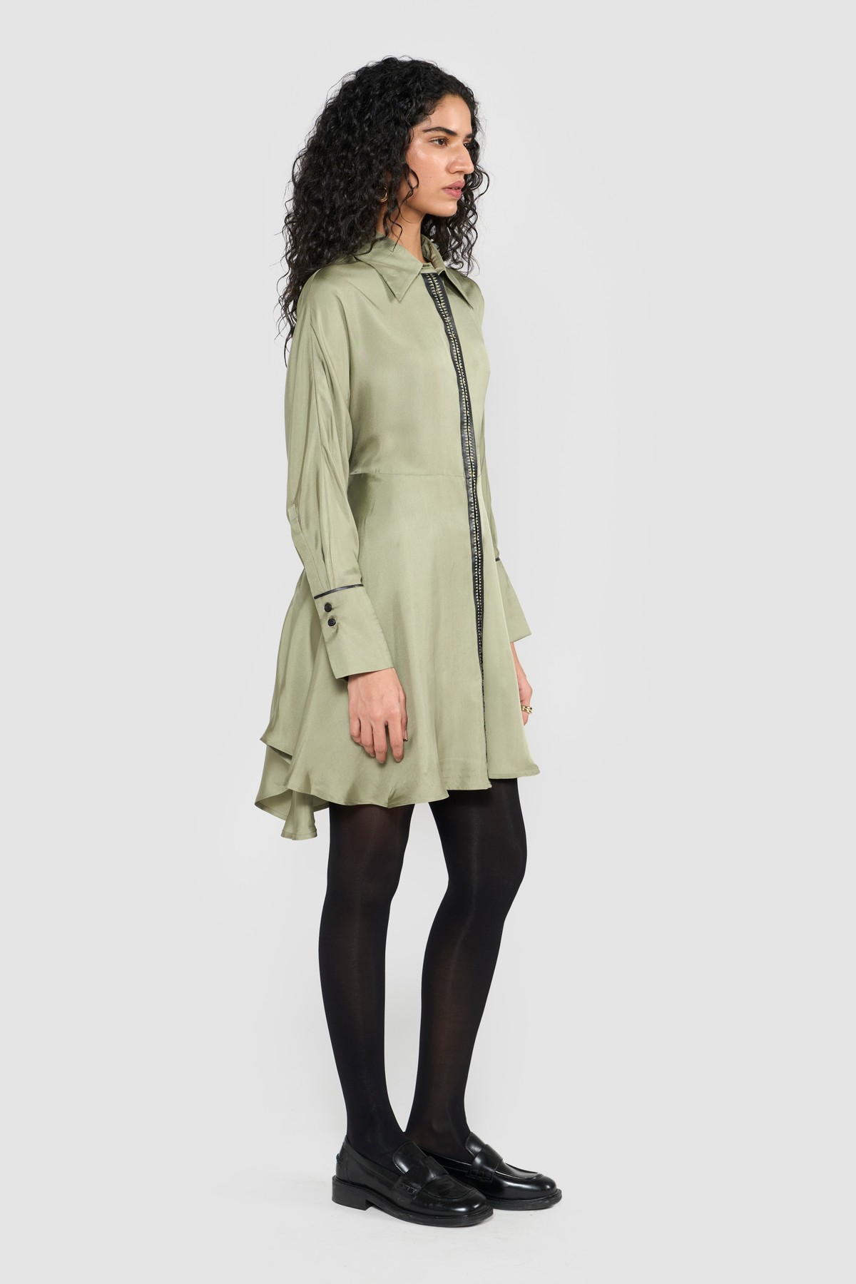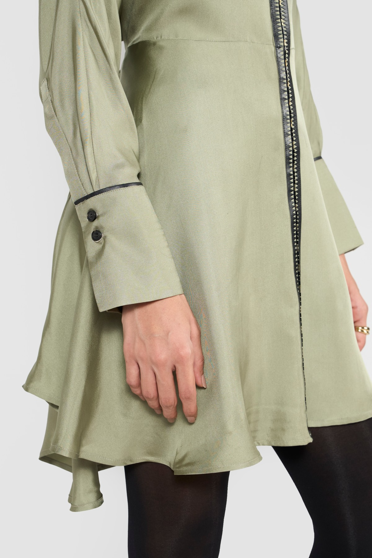 Elevate your wardrobe with this sophisticated shirt dress, a modern classic with unique detailing. Designed in a soft, flowing silhouette, the dress stands out with leather-detailed strips and delicate embroidery on the front double placket, giving it a refined yet edgy appeal. The black leather piping on the cuffs adds a bold contrast, while the front opening makes it easy to wear and versatile for styling. To enhance the shape, a belt at the back cinches the waist, ensuring a flattering fit that balances structure with elegance. Perfect for day-to-evening transitions, this dress combines timeless tailoring with contemporary accents.