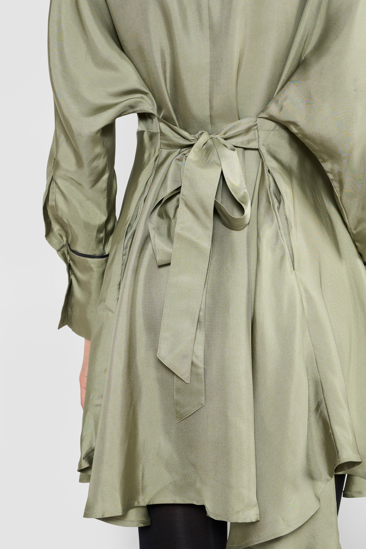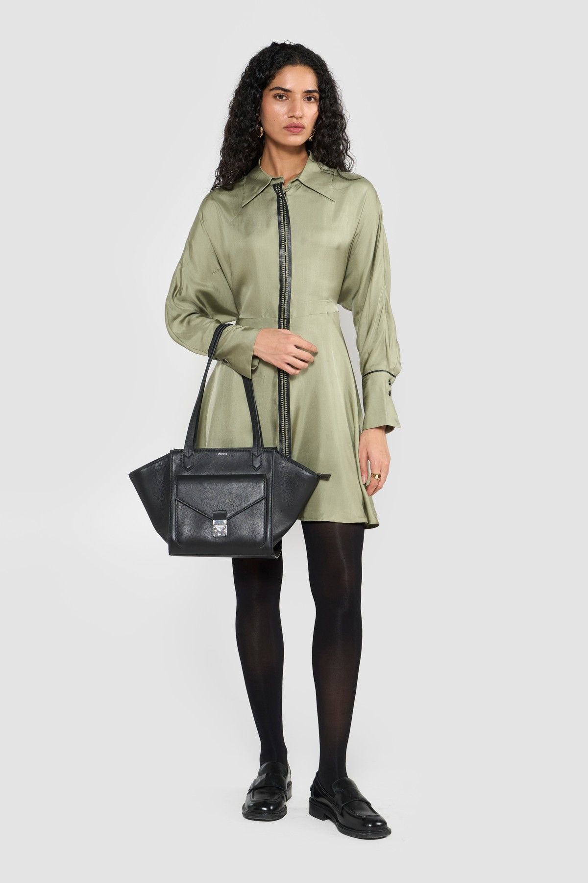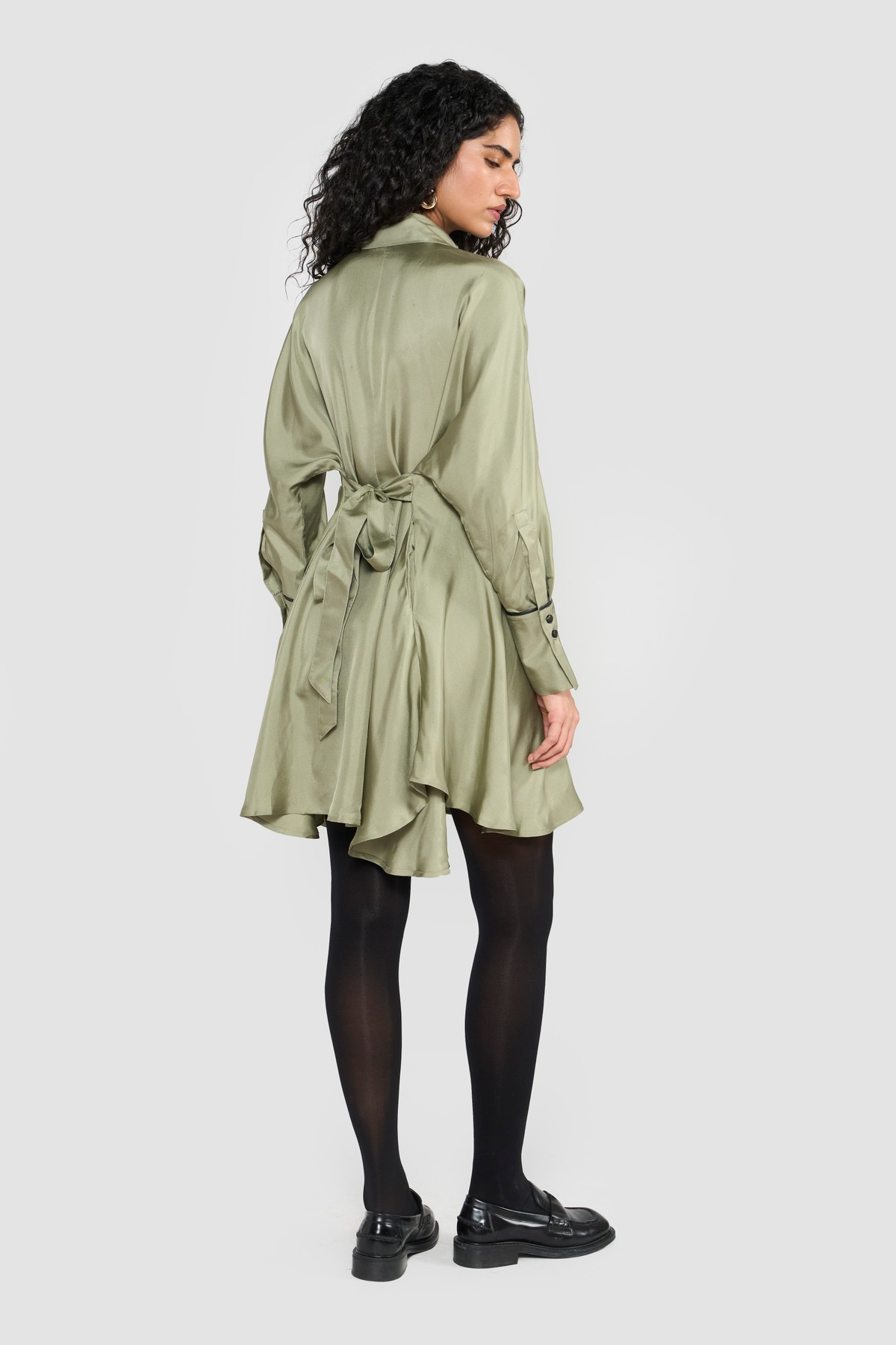 Elevate your wardrobe with this sophisticated shirt dress, a modern classic with unique detailing. Designed in a soft, flowing silhouette, the dress stands out with leather-detailed strips and delicate embroidery on the front double placket, giving it a refined yet edgy appeal. The black leather piping on the cuffs adds a bold contrast, while the front opening makes it easy to wear and versatile for styling. To enhance the shape, a belt at the back cinches the waist, ensuring a flattering fit that balances structure with elegance. Perfect for day-to-evening transitions, this dress combines timeless tailoring with contemporary accents.