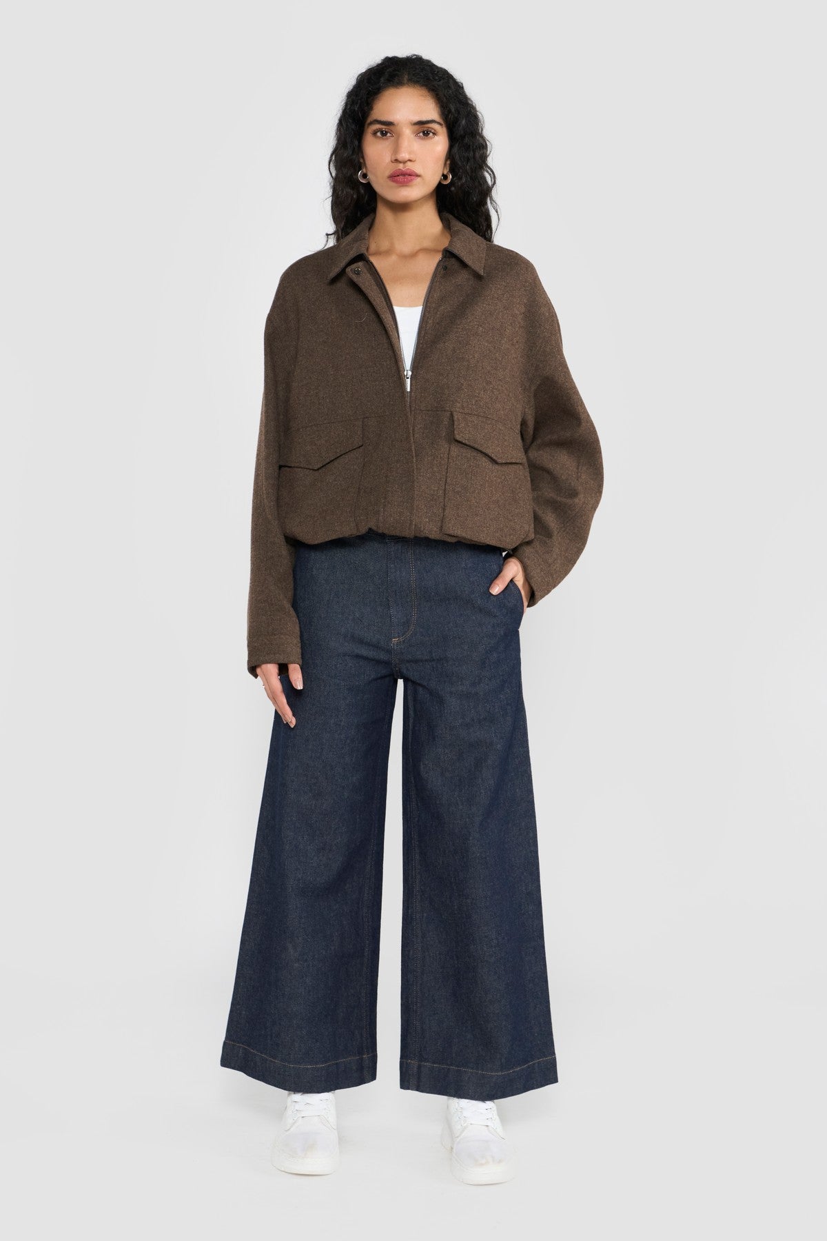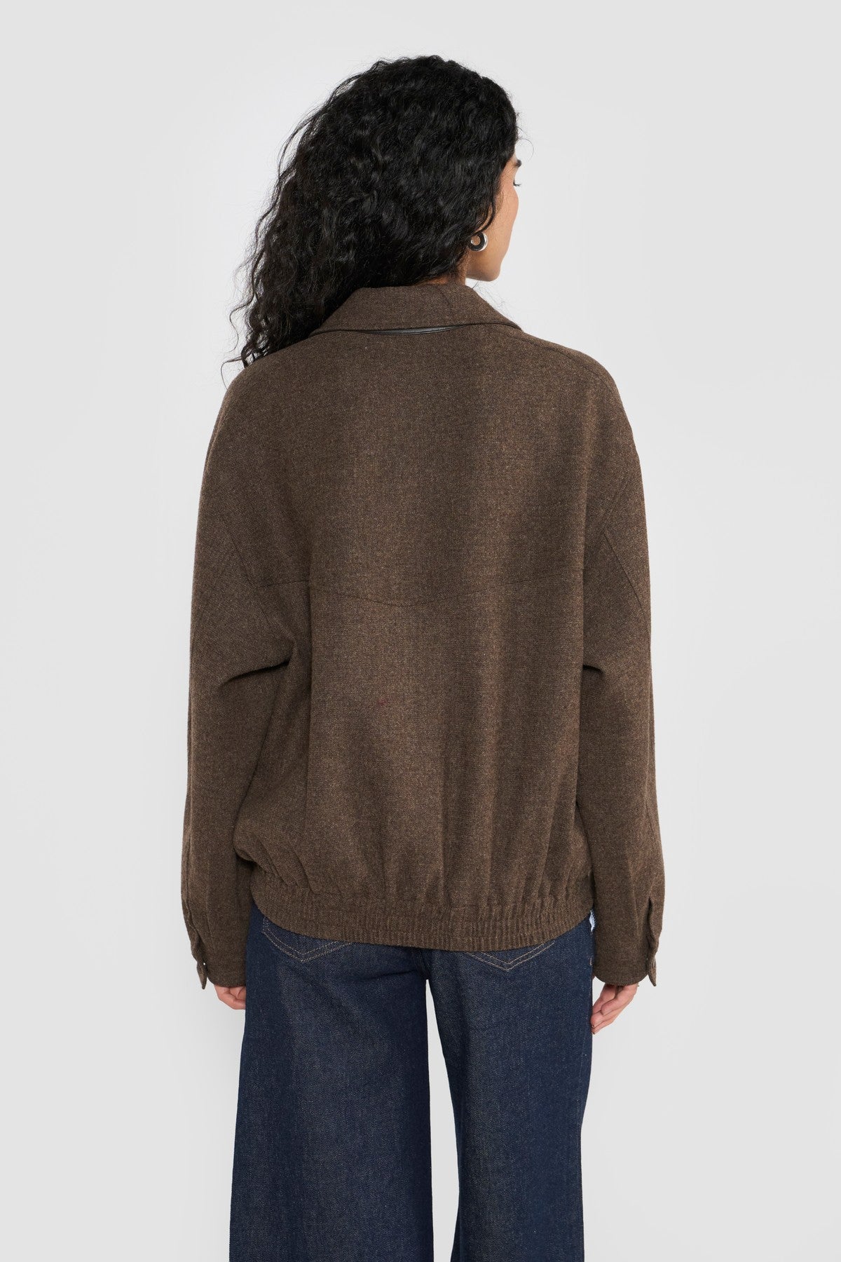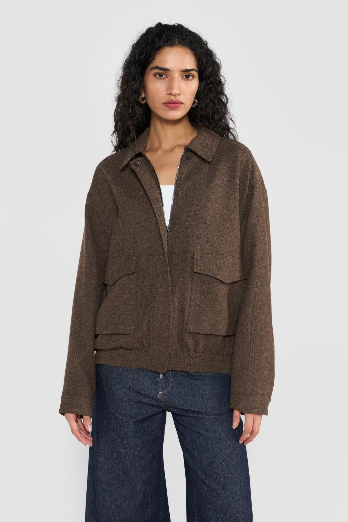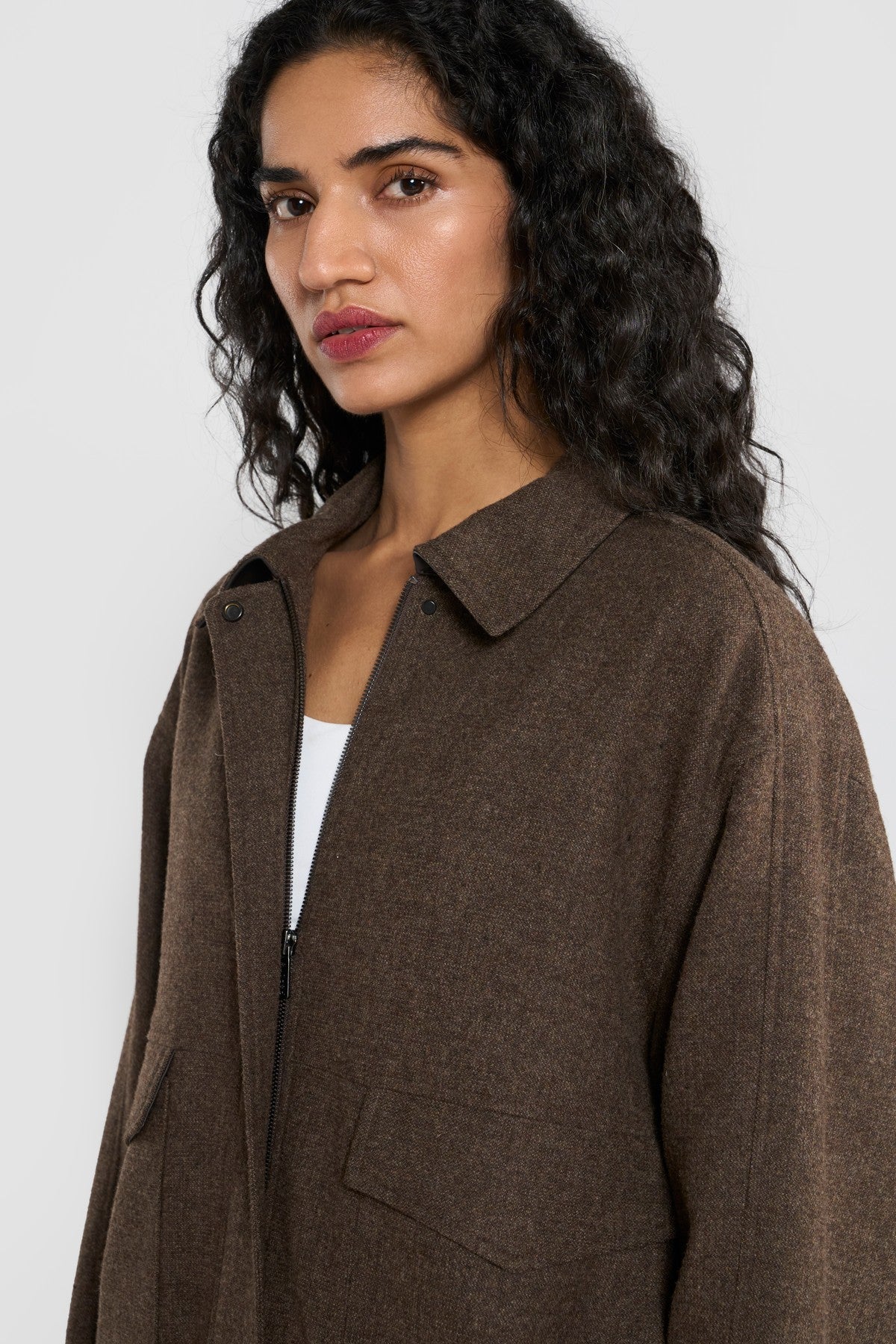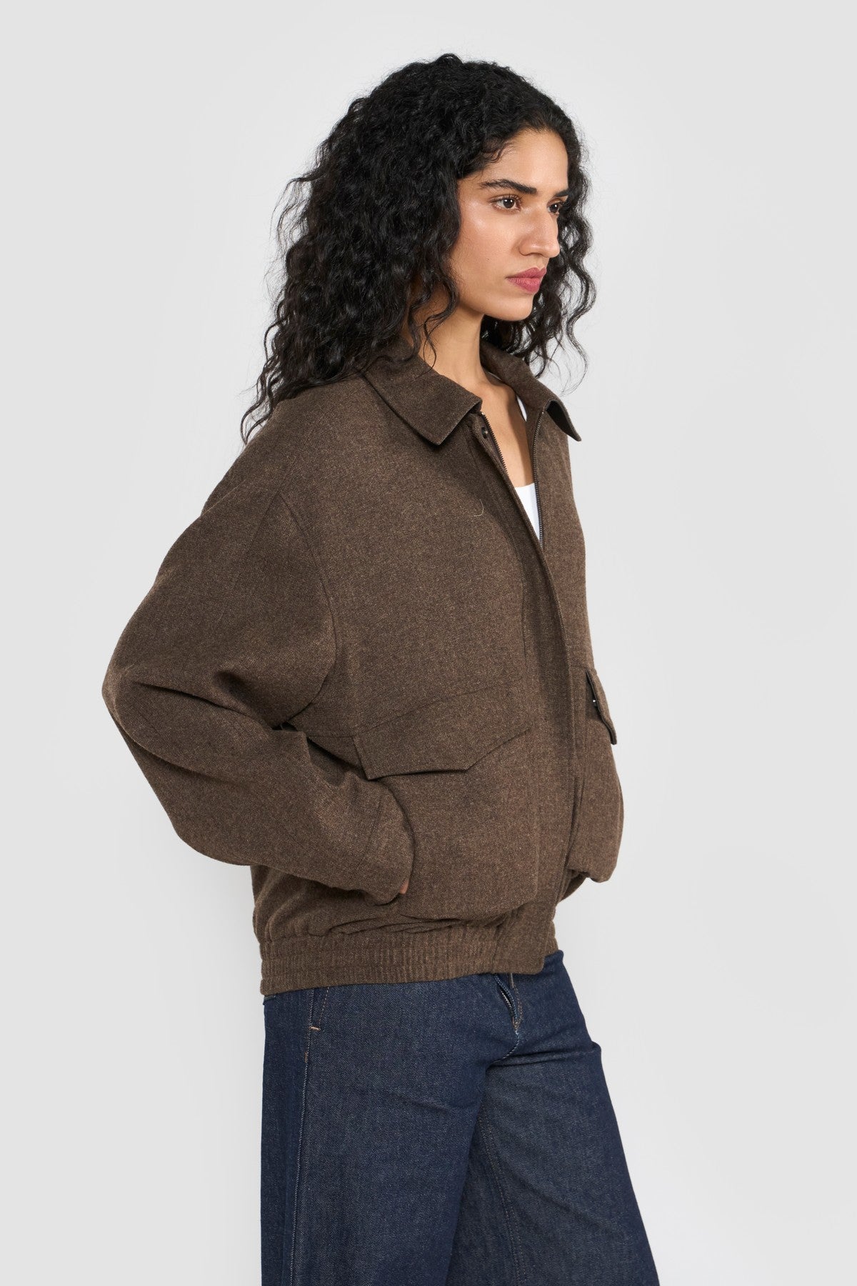This women's bomber jacket is a sophisticated fusion of timeless design and contemporary craftsmanship. Expertly tailored from Sheatlang fabric, it offers a soft yet structured feel with a distinctive texture that brings depth and character to the silhouette.The design features shirt collar and a GRS certified zipper closure, delivering both warmth and a bold, architectural look. Oversized flap pockets and elasticized hem and cuffs nod to classic bomber styling while enhancing comfort and functionality.Versatile and polished, this piece transitions effortlessly from casual daywear to elevated evening looks—offering a statement of refined style with a modern, fabric-forward edge.