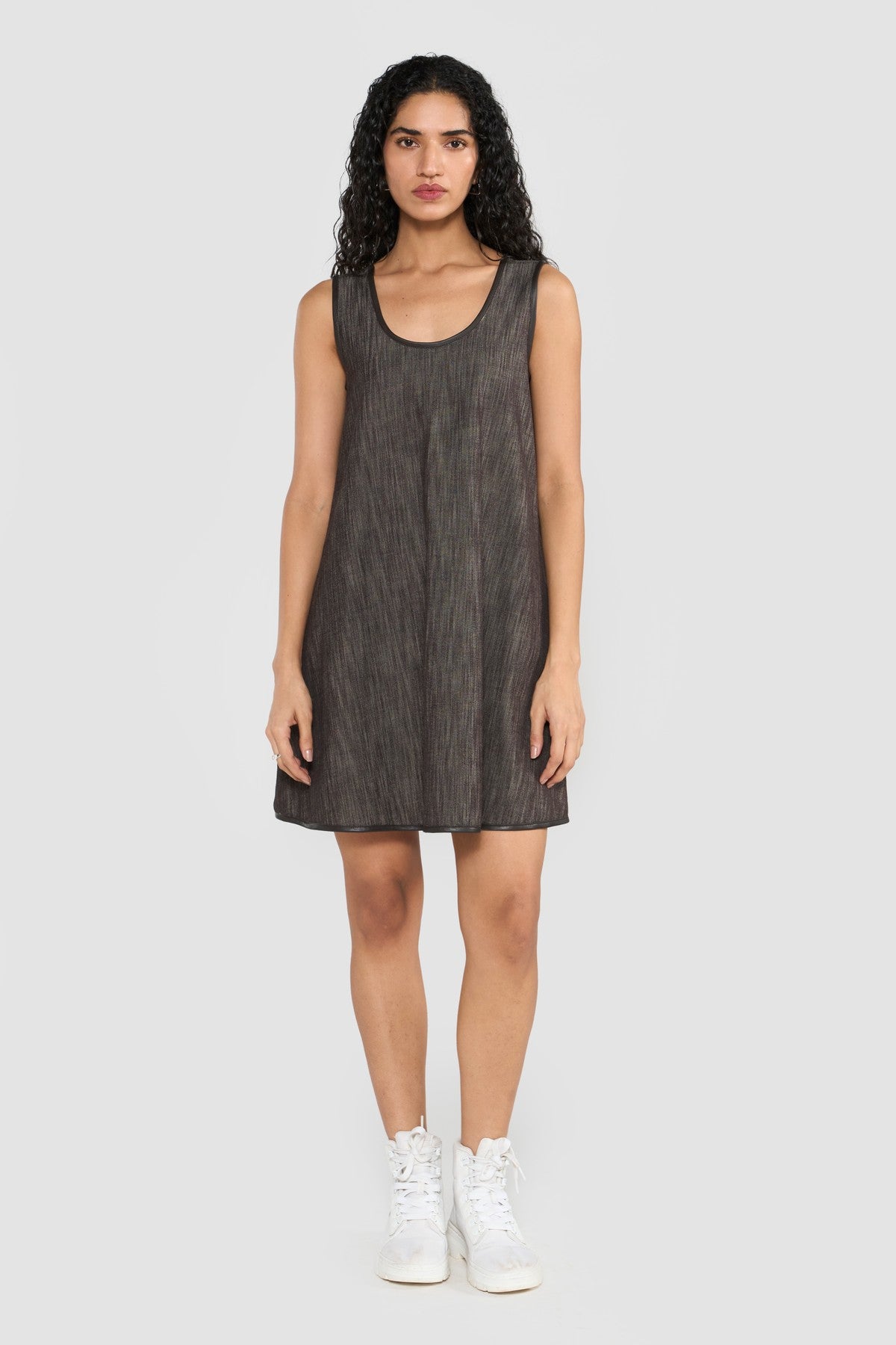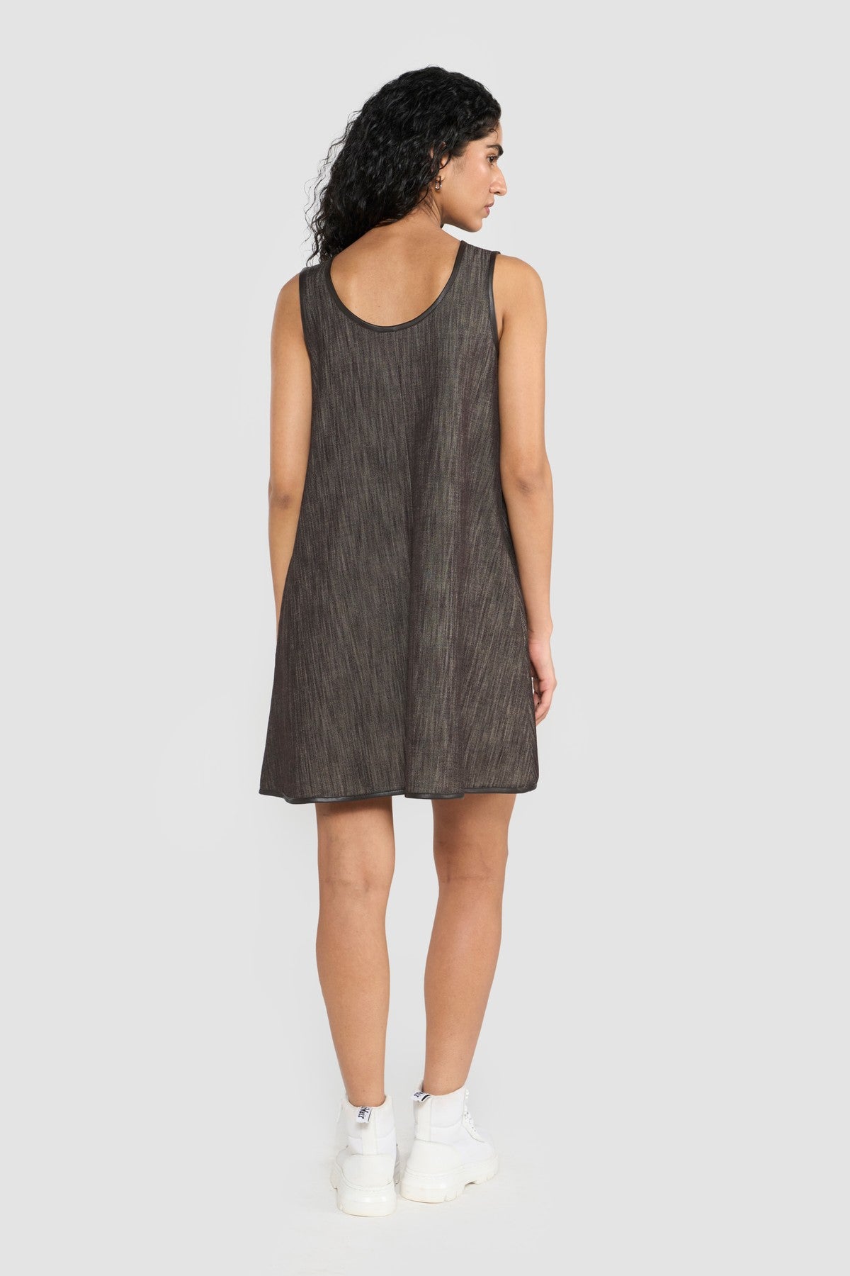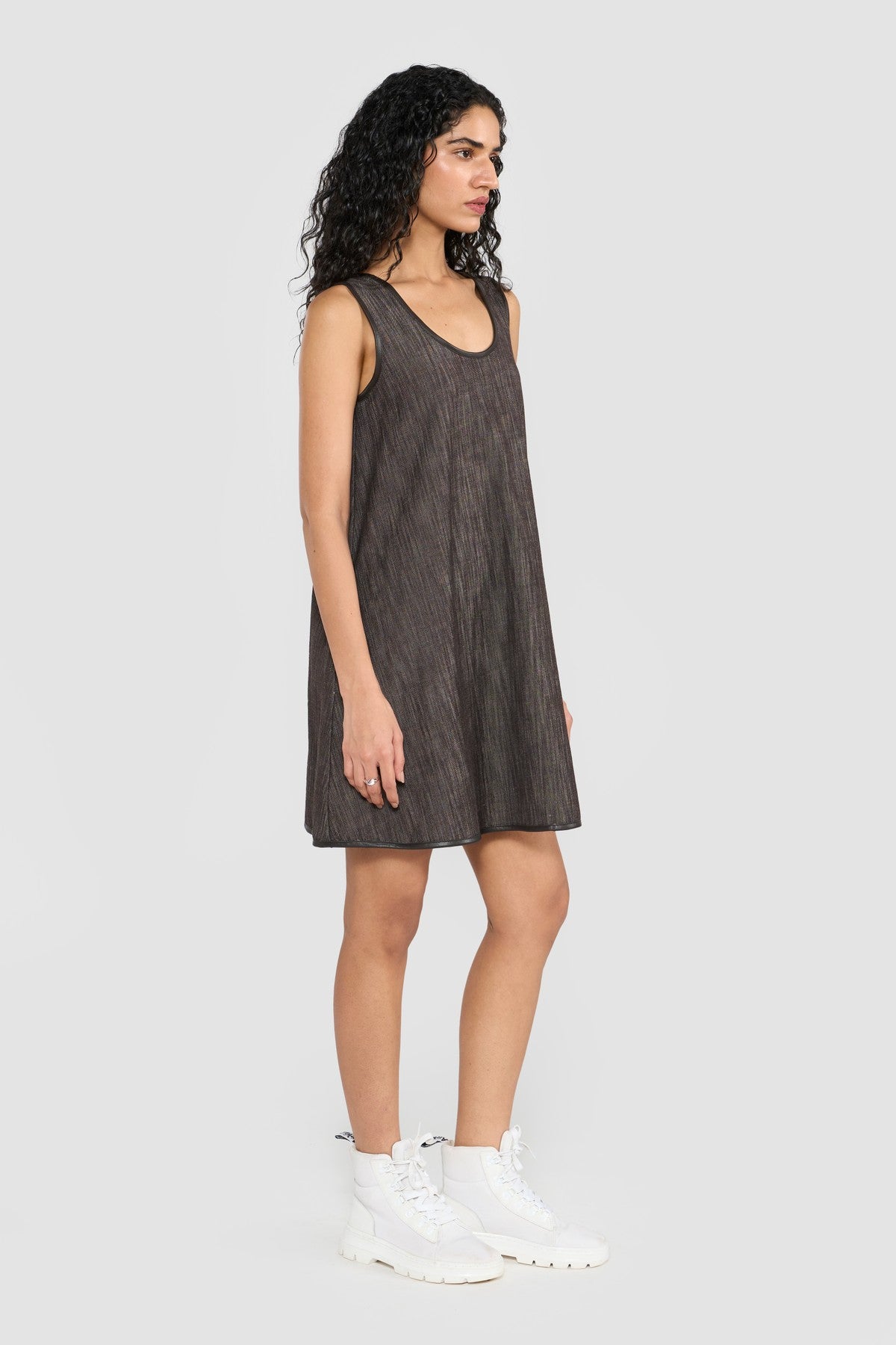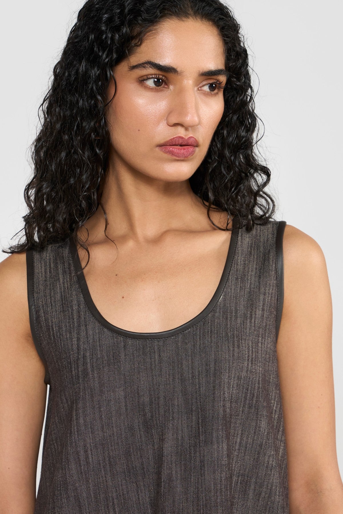Crafted from OEKO-TEX® certified premium viscose blend denim, this tunic dress balances the fluid drape of viscose with the structured character of denim. The sleeveless cut and soft scoop neckline bring a relaxed elegance, while the easy, flared silhouette ensures effortless movement. Accentuated with fine leather trims along the hemline, the design adds a subtle edge and modern refinement. Versatile in nature, it can be styled alone for a minimalist statement or layered for a contemporary look. Pair it with our exclusive Louisa leather shirt to create a complete, iconic look.