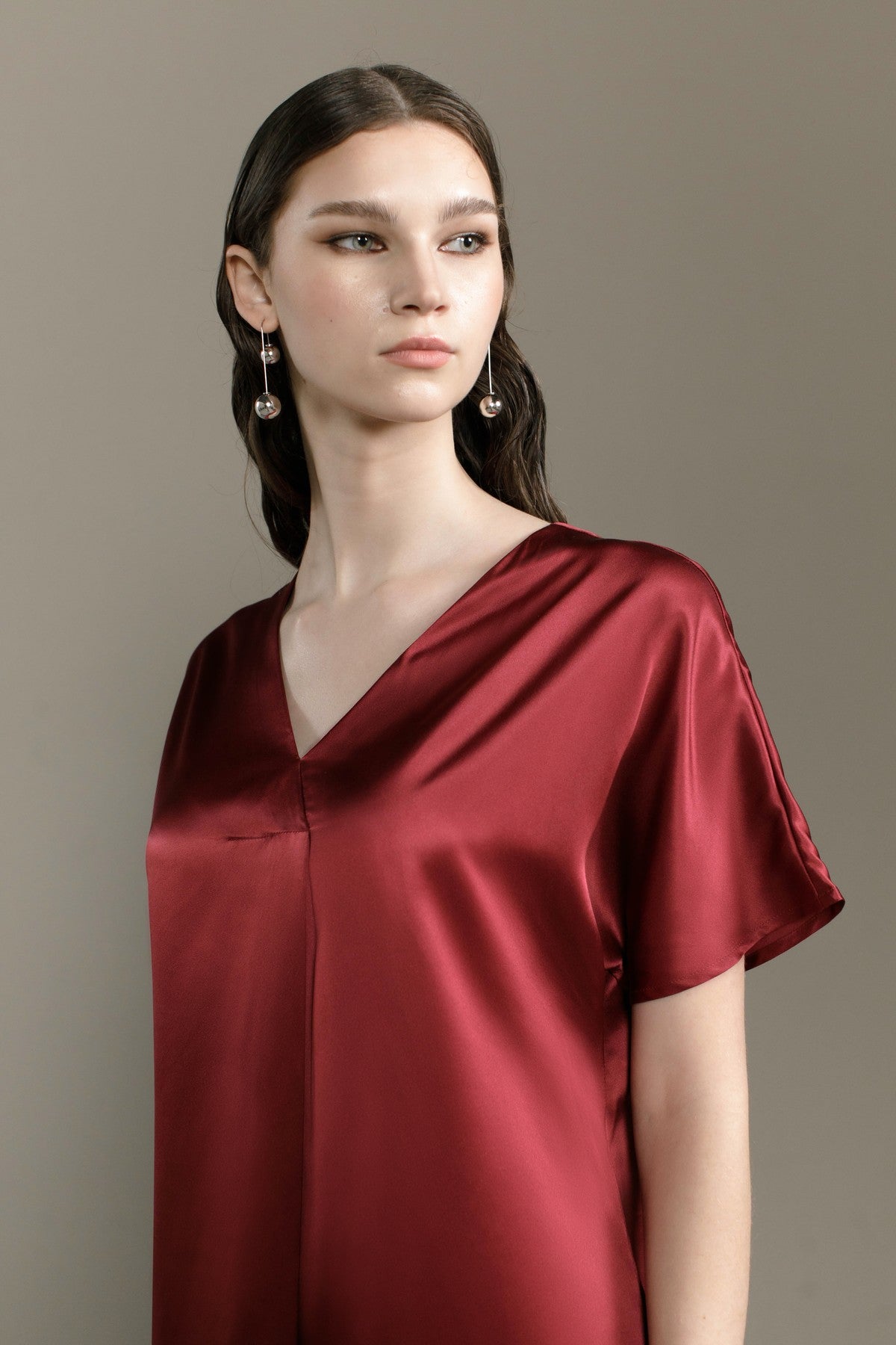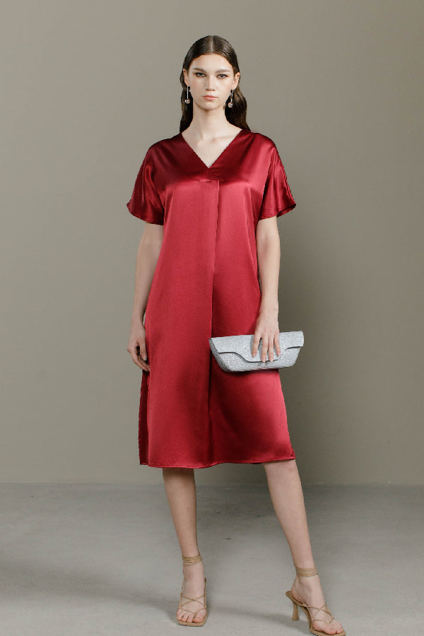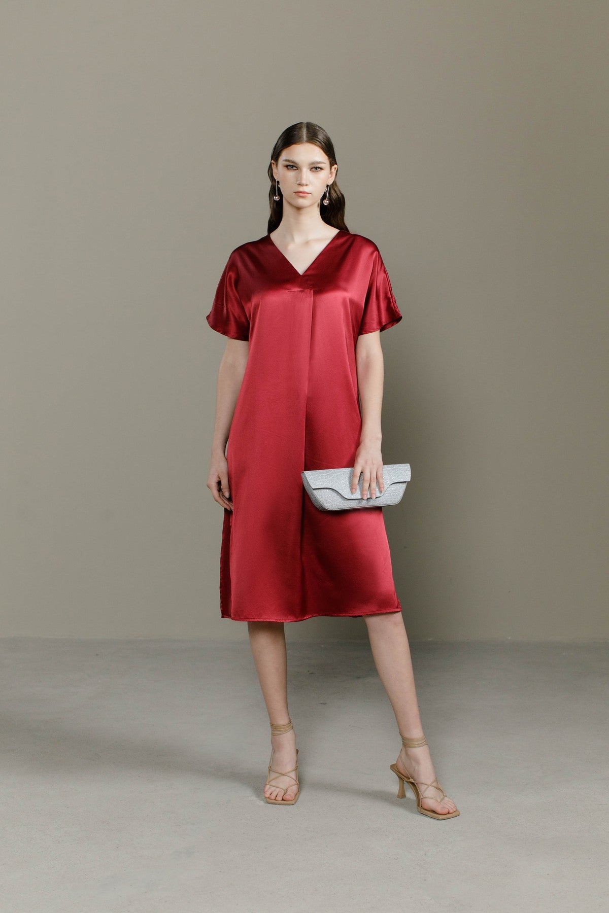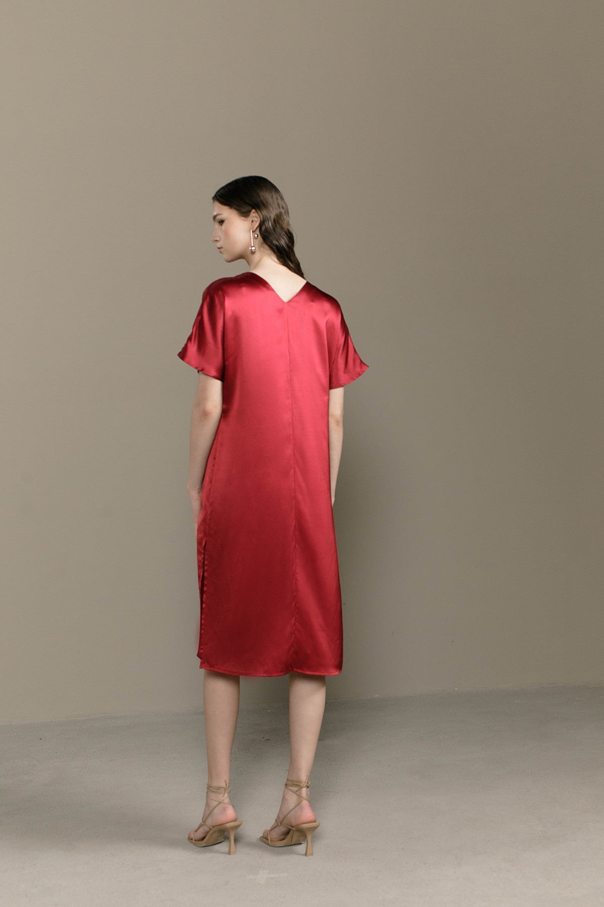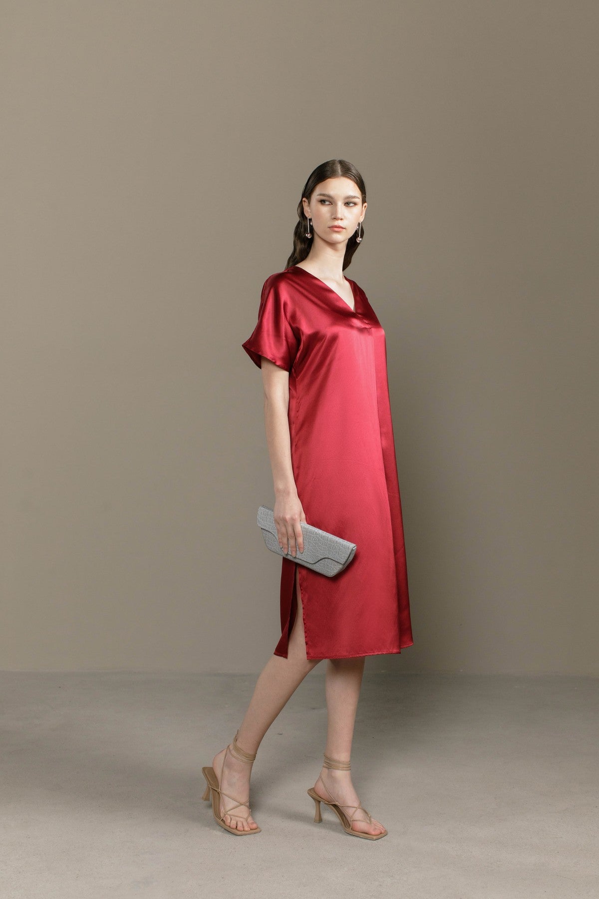 Crafted from luxe pure silk in a bright red hue, this midi dress is cut for a regular fit. It features high side slits for ease of movement and a wide, ruffle half-length sleeve for an exaggerated silhouette.