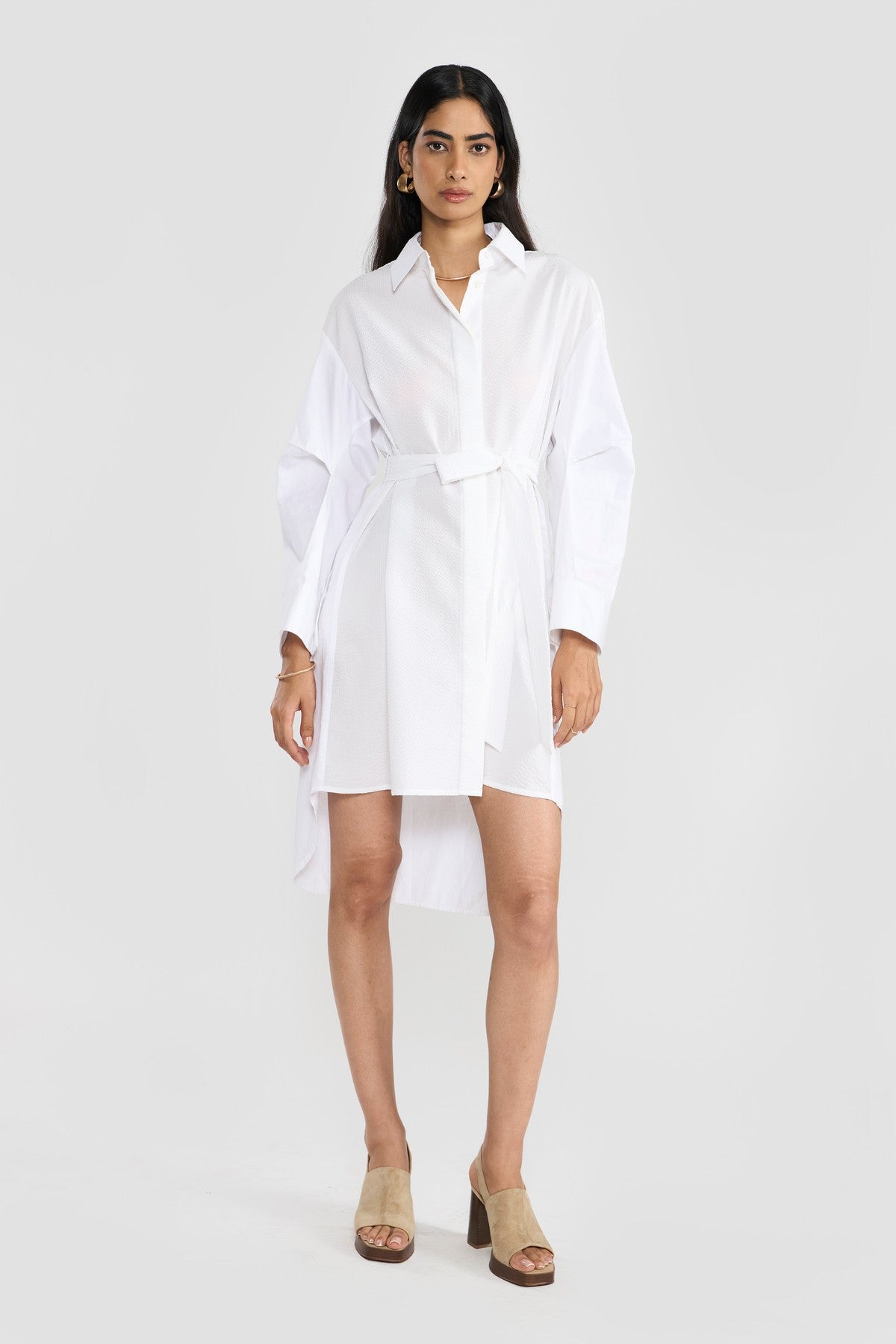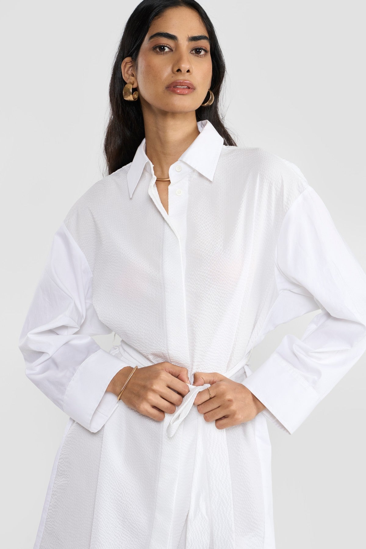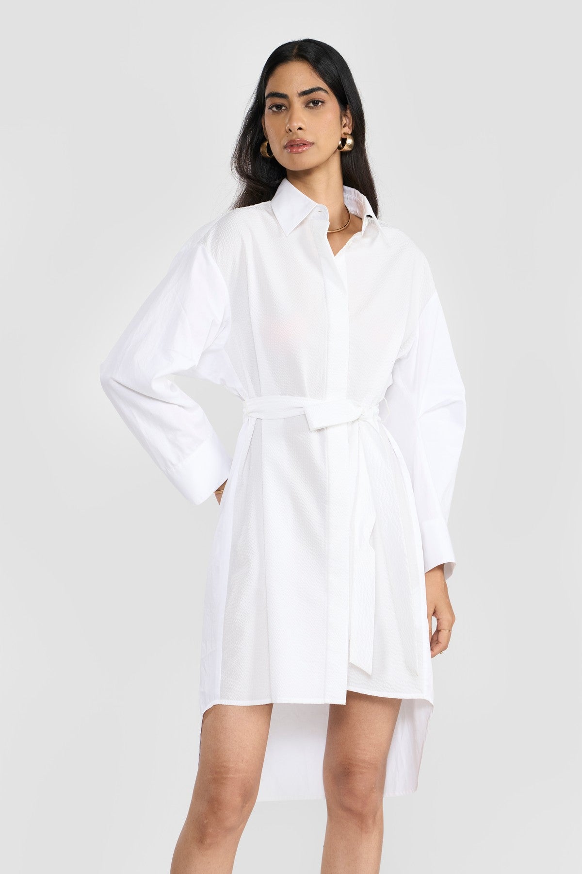 Crafted from a OEKO-TEX®, GOTS and BCI certified eco friendly premium cotton with a hint of stretch for added comfort in combination with tonal textured seersucker developed by slack-tension weaving process that results in the uniquely natural alternating texture known for its breathability creating colour blocking effect. The solid color of the fabric accentuates its fine texture and enhances its beautiful finish. Contemporary details update the classic inspiration of this new shirt dress making it a perennial wardrobe staple. Perona's modern shirt dress is cut in a relaxed silhouette that's enhanced by pointed shirt collar, concealed placket, box pleates at the sleeve elbow for additional volume, side slits and relaxed silhouette. The waist belt gathers the garment’s soft volume.
