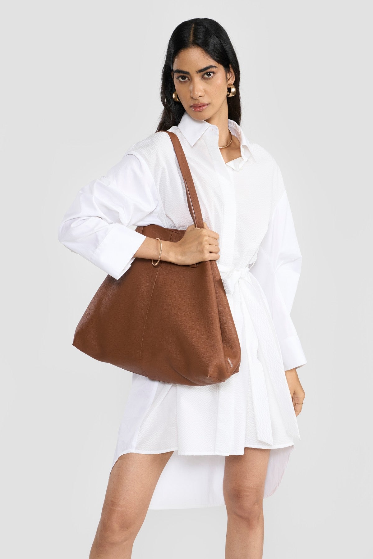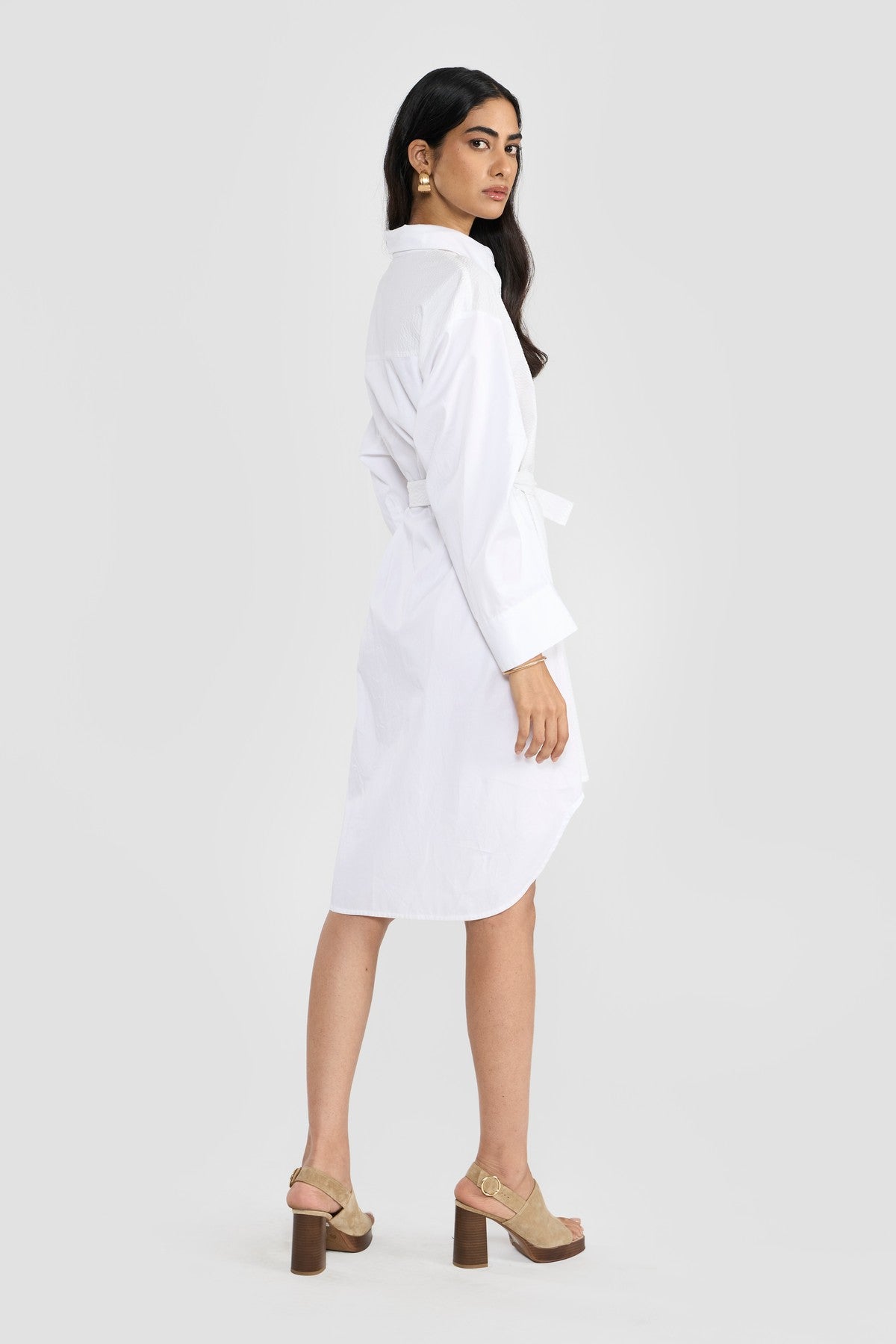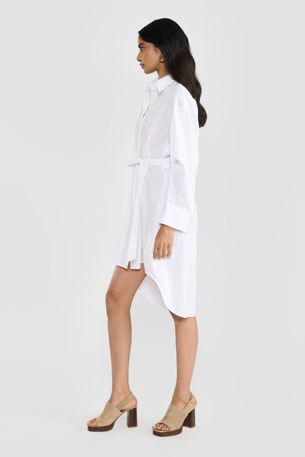 Crafted from a OEKO-TEX®, GOTS and BCI certified eco friendly premium cotton with a hint of stretch for added comfort in combination with tonal textured seersucker developed by slack-tension weaving process that results in the uniquely natural alternating texture known for its breathability creating colour blocking effect. The solid color of the fabric accentuates its fine texture and enhances its beautiful finish. Contemporary details update the classic inspiration of this new shirt dress making it a perennial wardrobe staple. Perona's modern shirt dress is cut in a relaxed silhouette that's enhanced by pointed shirt collar, concealed placket, box pleates at the sleeve elbow for additional volume, side slits and relaxed silhouette. The waist belt gathers the garment’s soft volume.