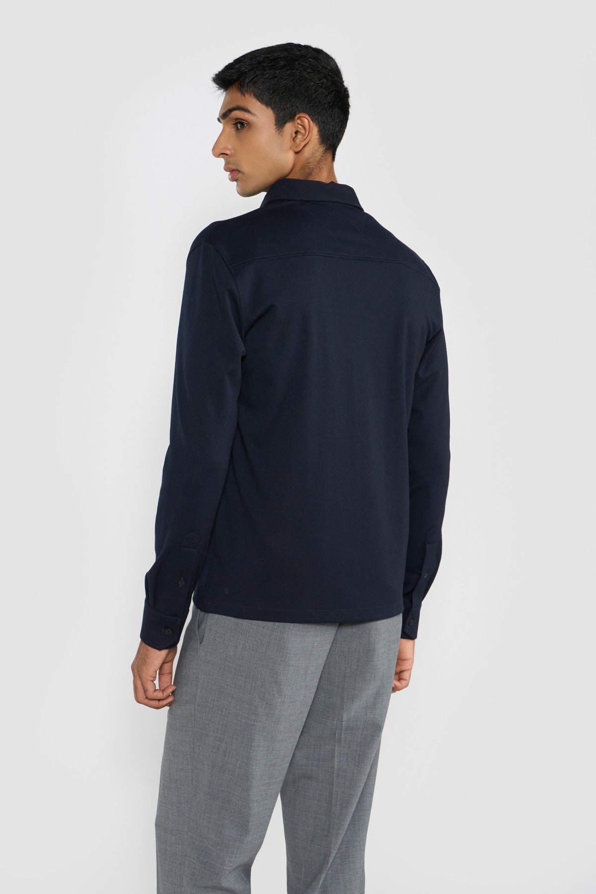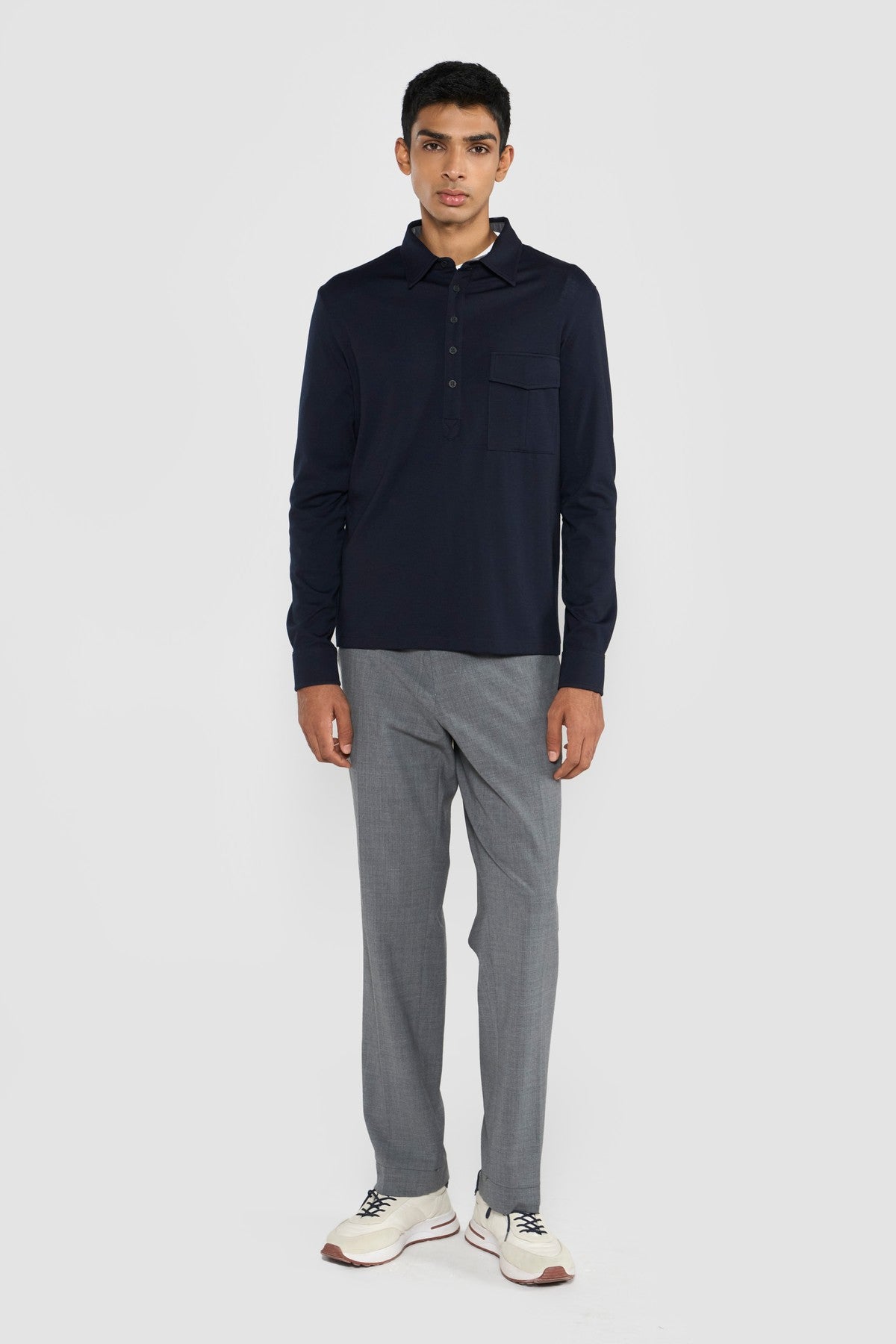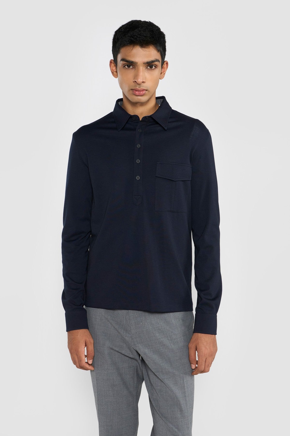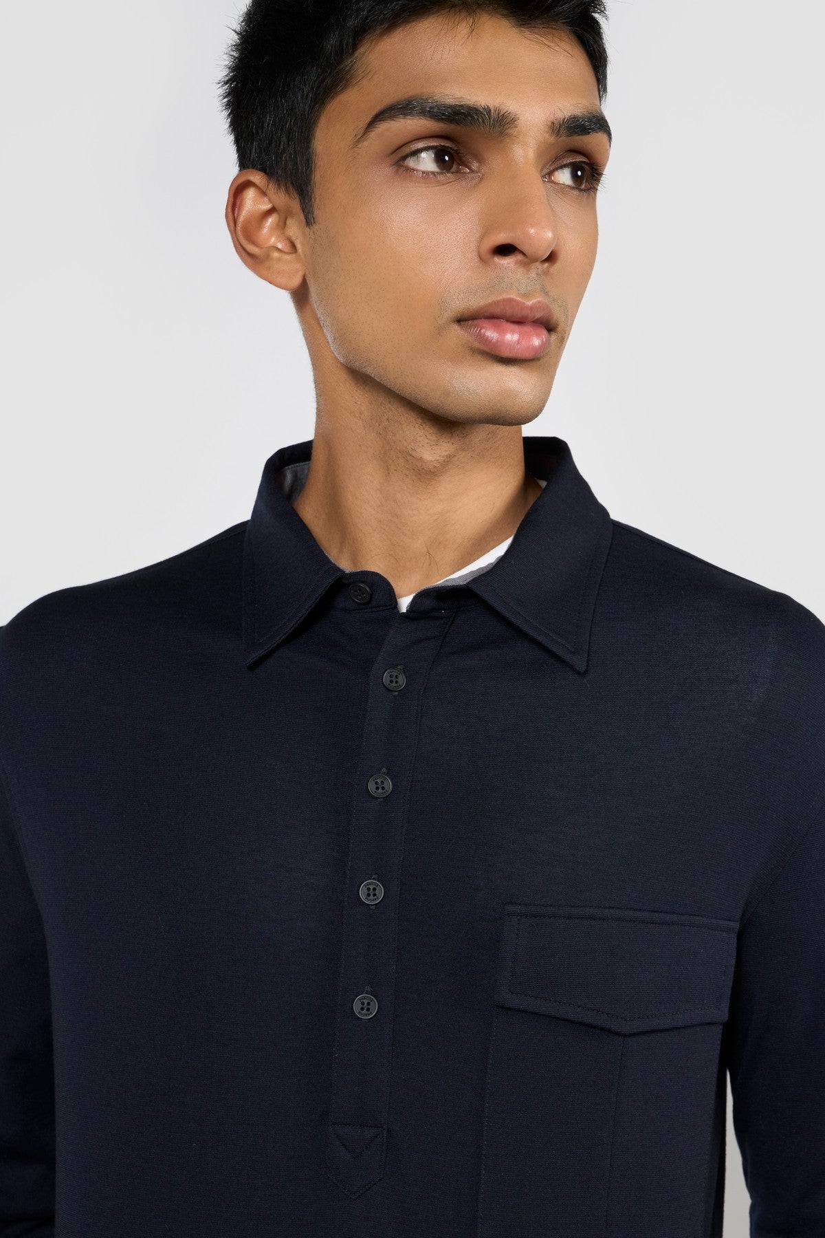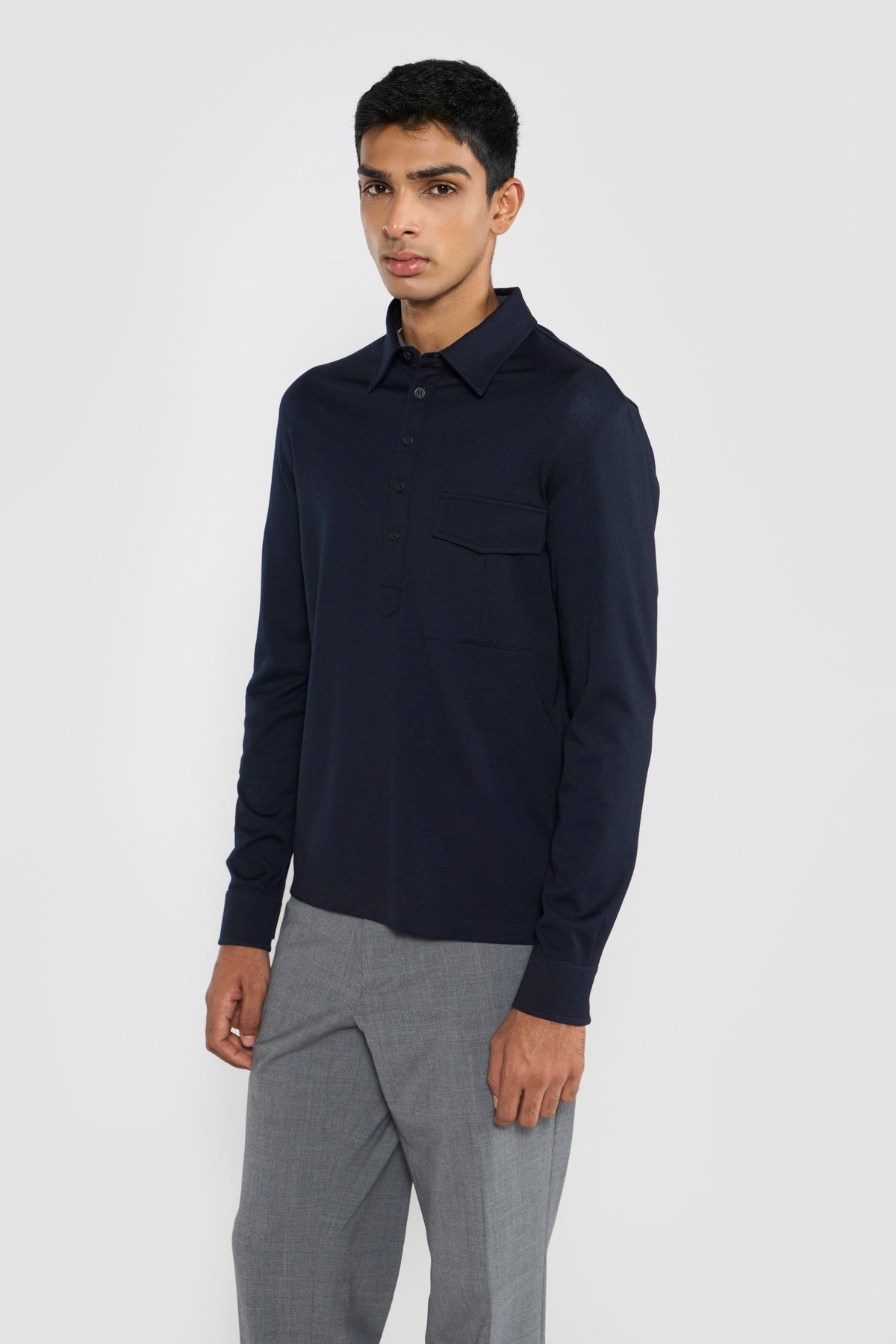 A modern take on a timeless essential, this full-sleeve polo transitions with ease.Crafted from an OEKO-TEX® certified wool-lyocell blend, it balances softness, structure, and sustainability in a streamlined silhouette. Lyocel content provides lightness and a smooth sensation against the skin. The shirt-style collar detail completes the regular silhouette.The design is thoughtfully detailed with a polo collar, elongated placket, and two-toned buttons, offering a subtle play on contrasts.In a deep midnight blue hue, it transitions seamlessly—whether paired with denim or elevated tailoring.Relaxed fit