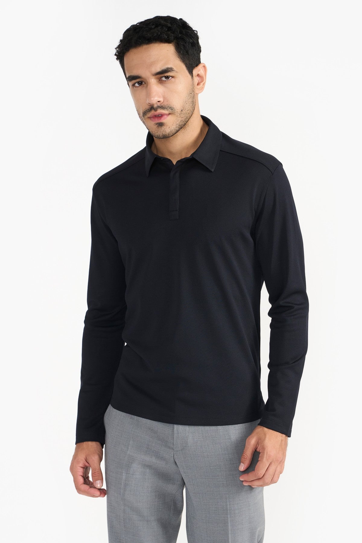 A contemporary style crafted from 100% recycled polyester, this polo neck T-shirt fastens with metal snap button on the neckline. A wardrobe essential.
