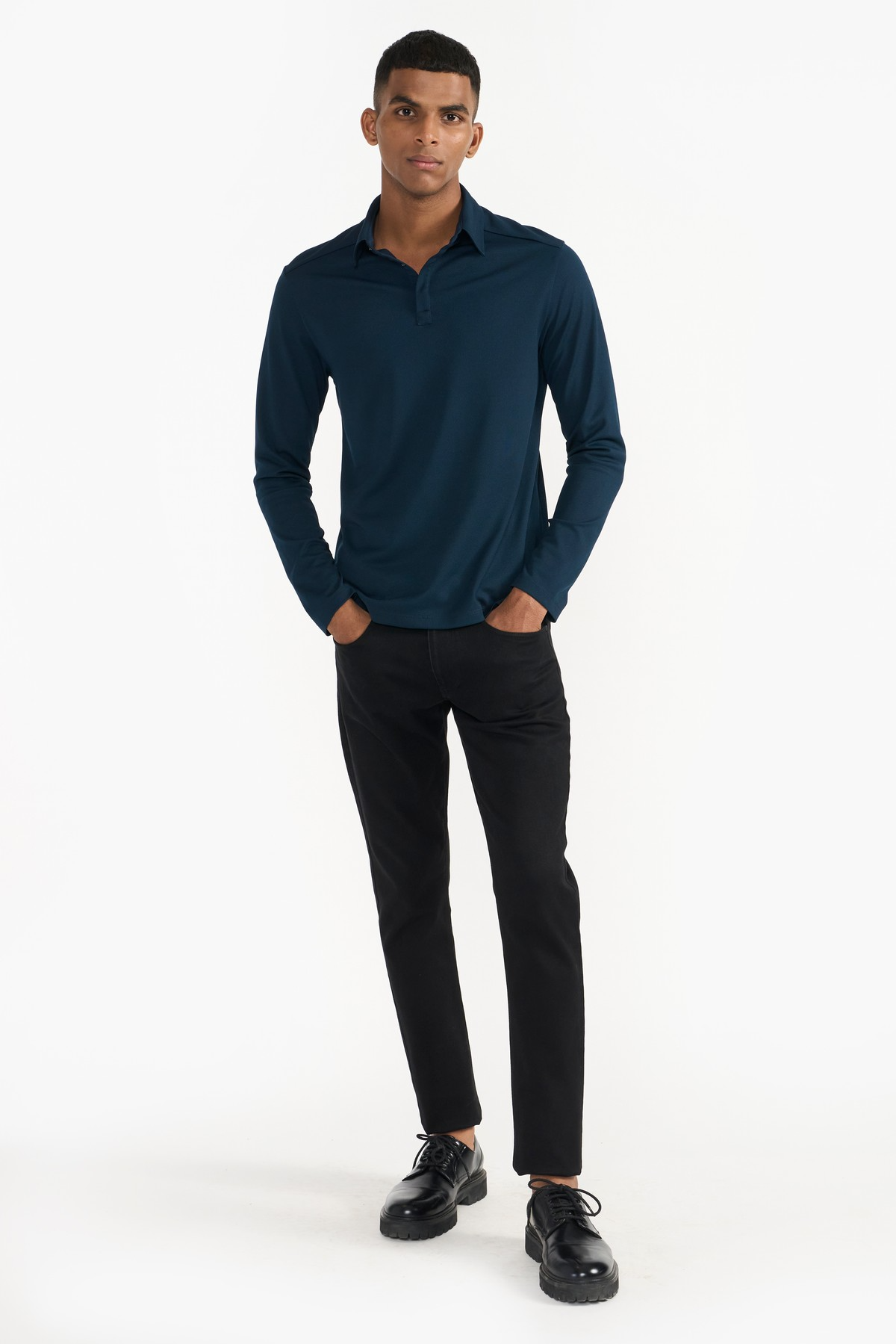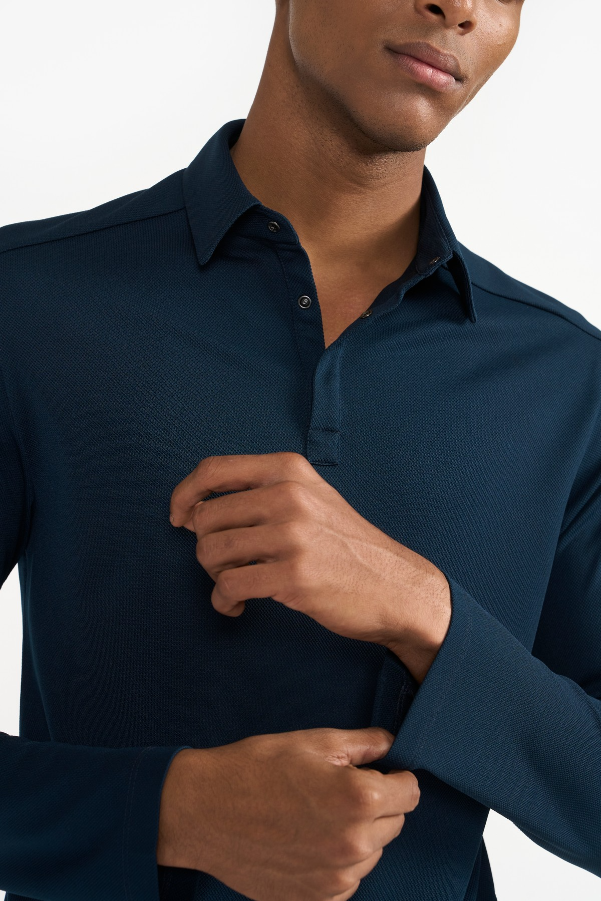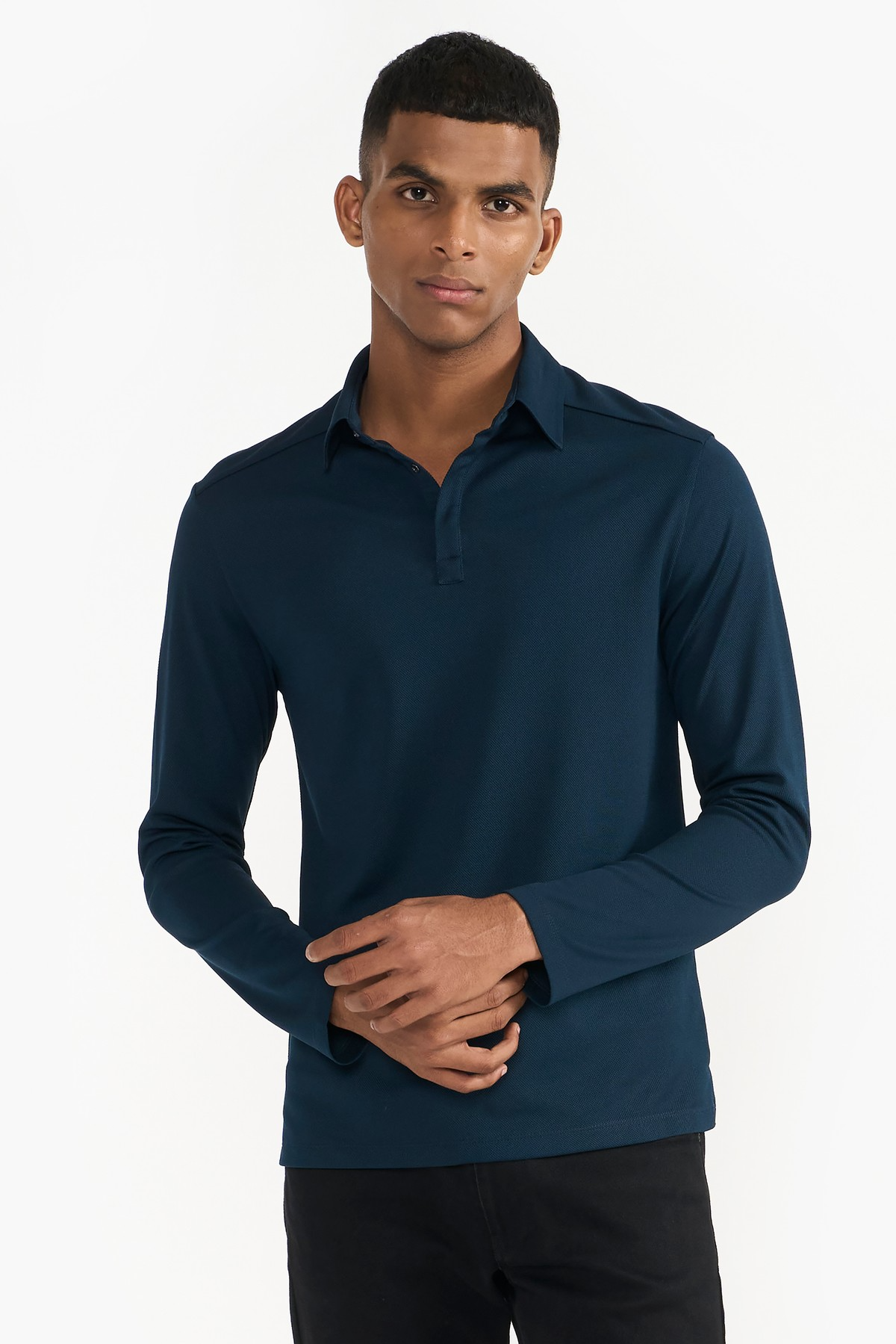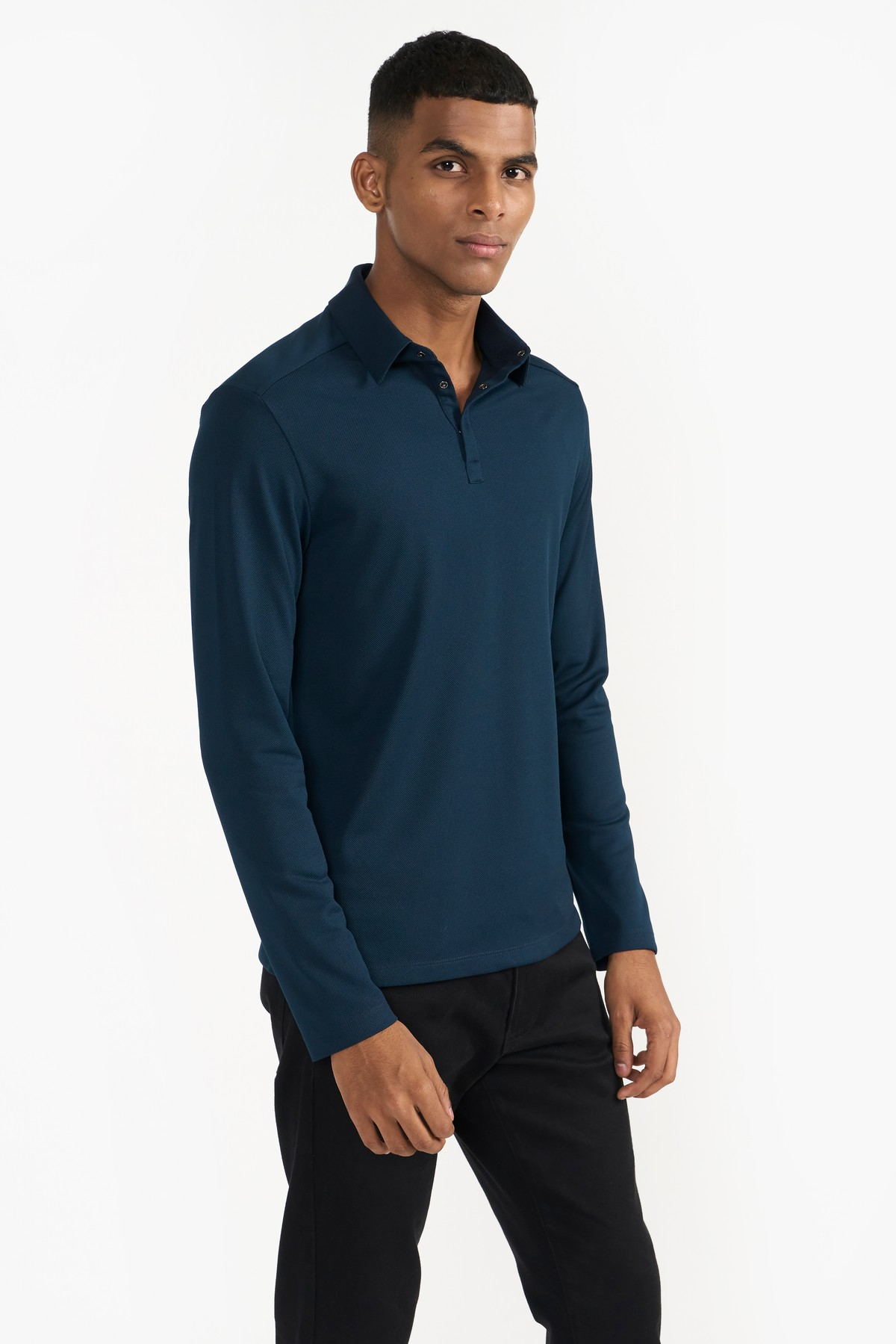 A contemporary style crafted from 100% recycled polyester, this polo neck T-shirt fastens with metal snap button on the neckline. A wardrobe essential.