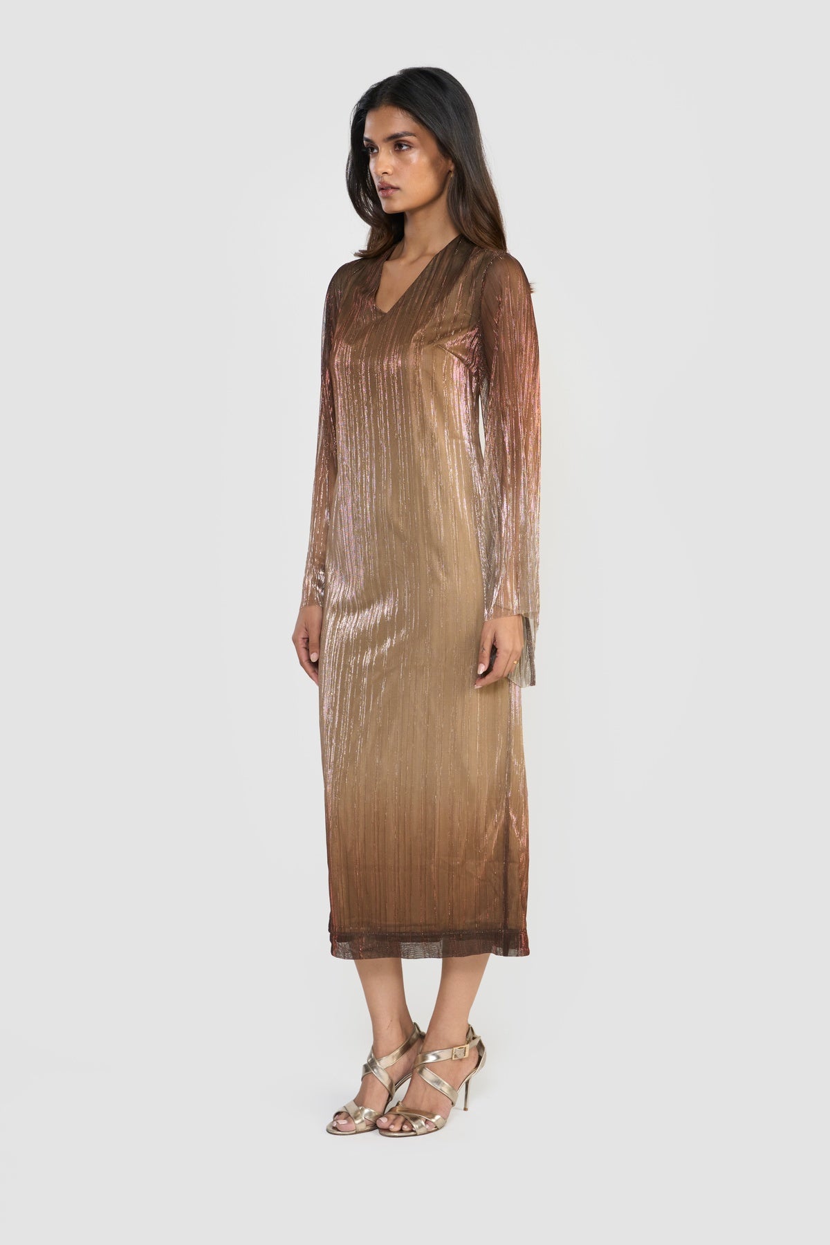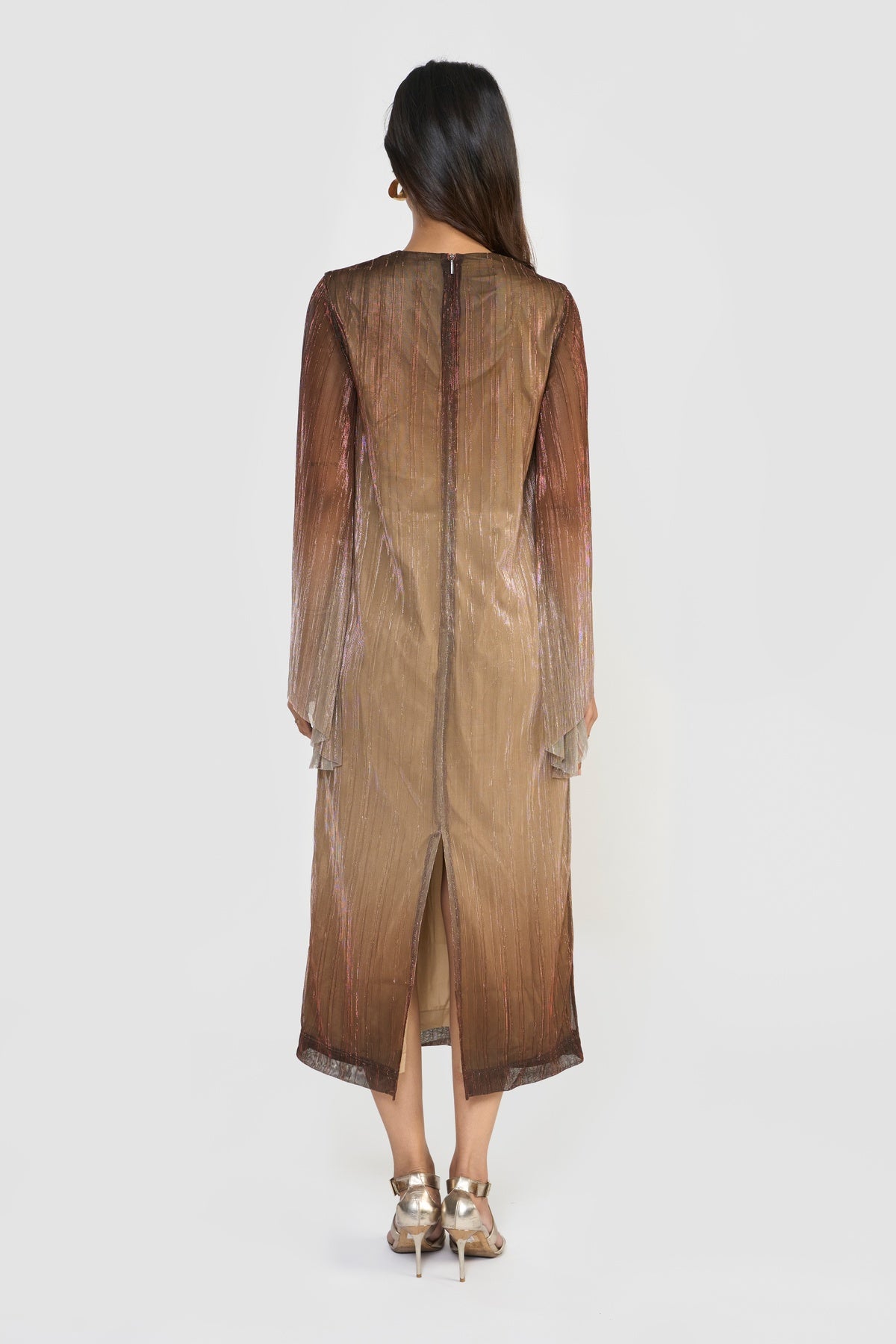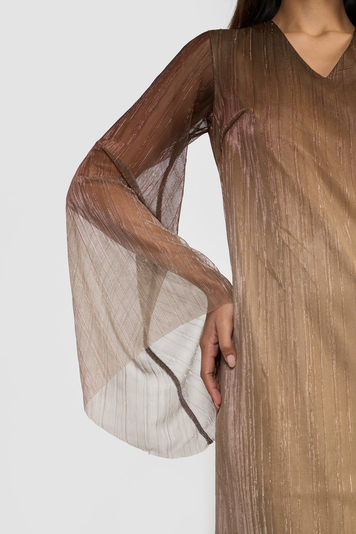 Rendered in a premium shimmer fabric with an ombré effect in brown tones, this dress captures fluid luminosity with understated glamour. The extended bell sleeves flow into an asymmetrical hemline, creating a graceful handkerchief drape that moves effortlessly with the body. Designed in a full-length silhouette, the dress is finished with a back slit that adds modern edge and ease of movement.