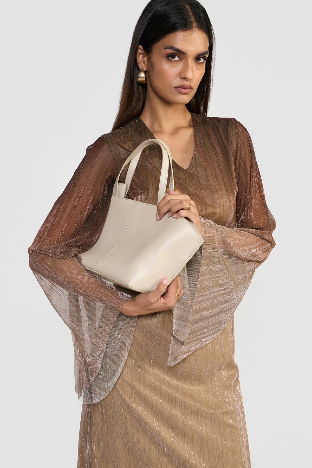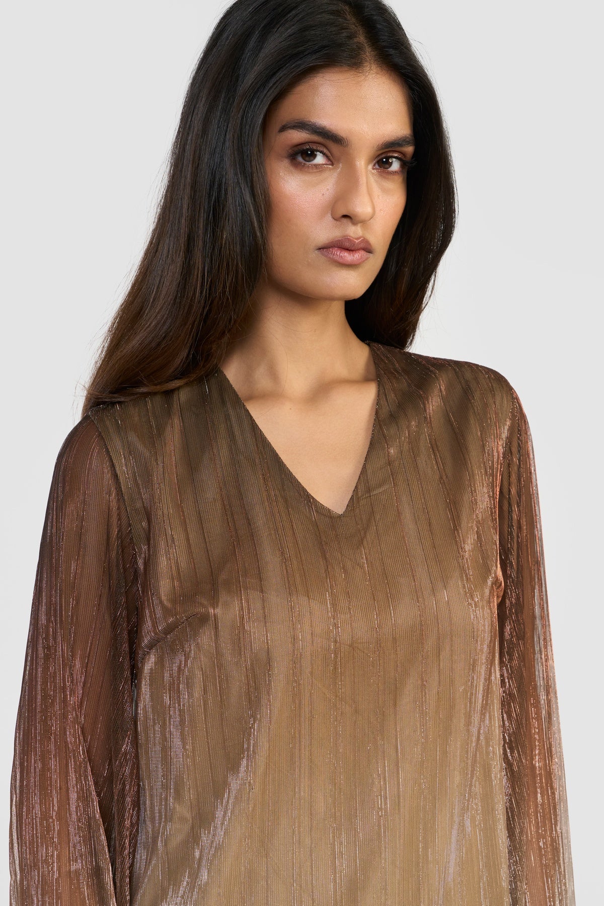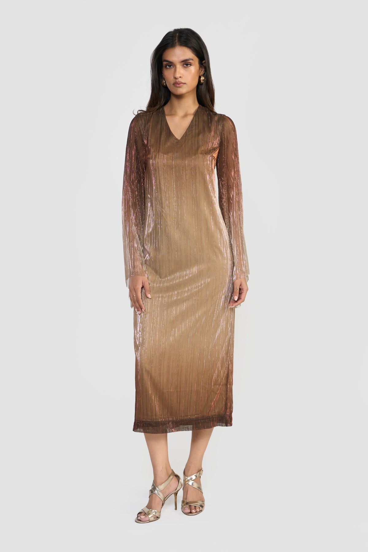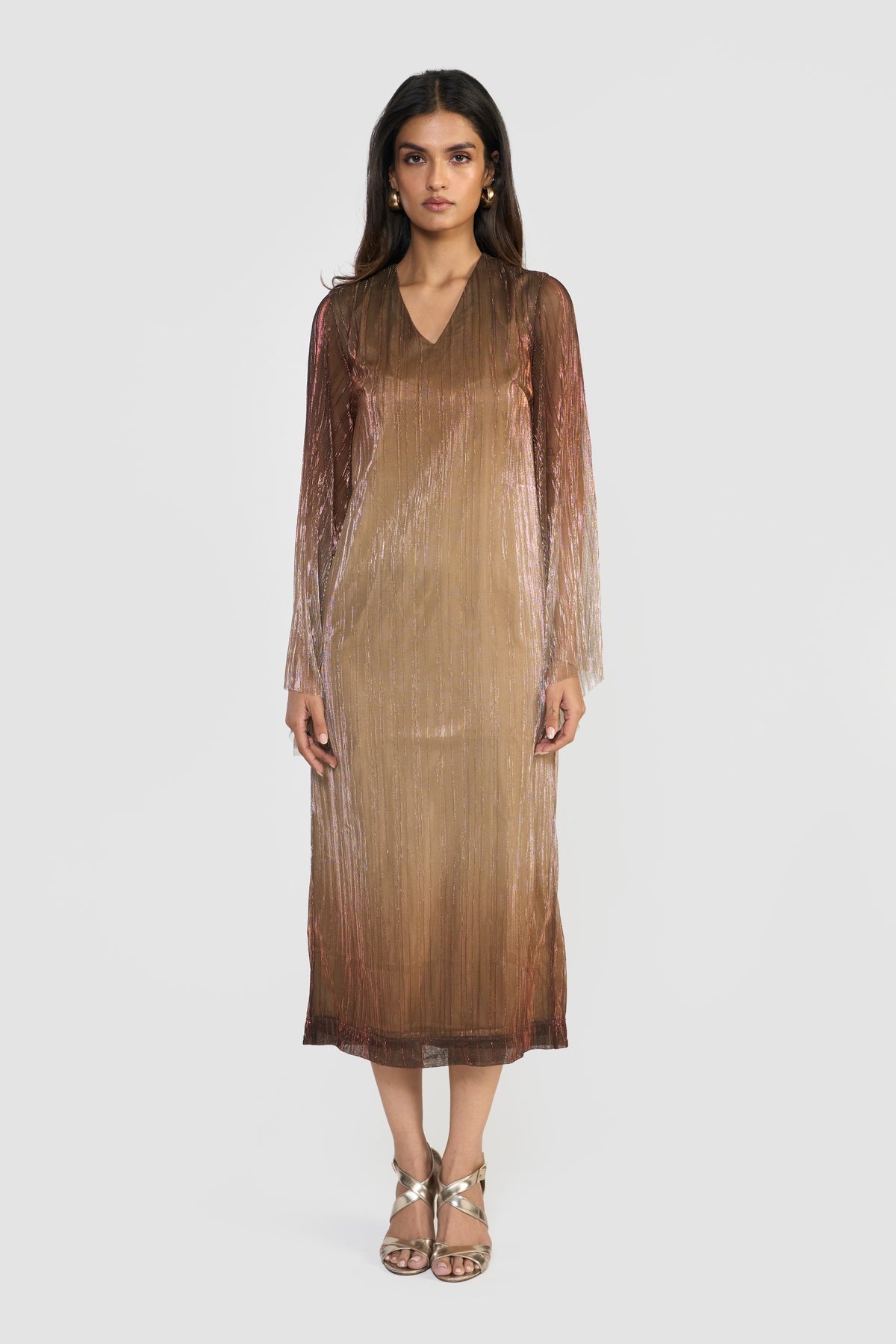 Rendered in a premium shimmer fabric with an ombré effect in brown tones, this dress captures fluid luminosity with understated glamour. The extended bell sleeves flow into an asymmetrical hemline, creating a graceful handkerchief drape that moves effortlessly with the body. Designed in a full-length silhouette, the dress is finished with a back slit that adds modern edge and ease of movement.