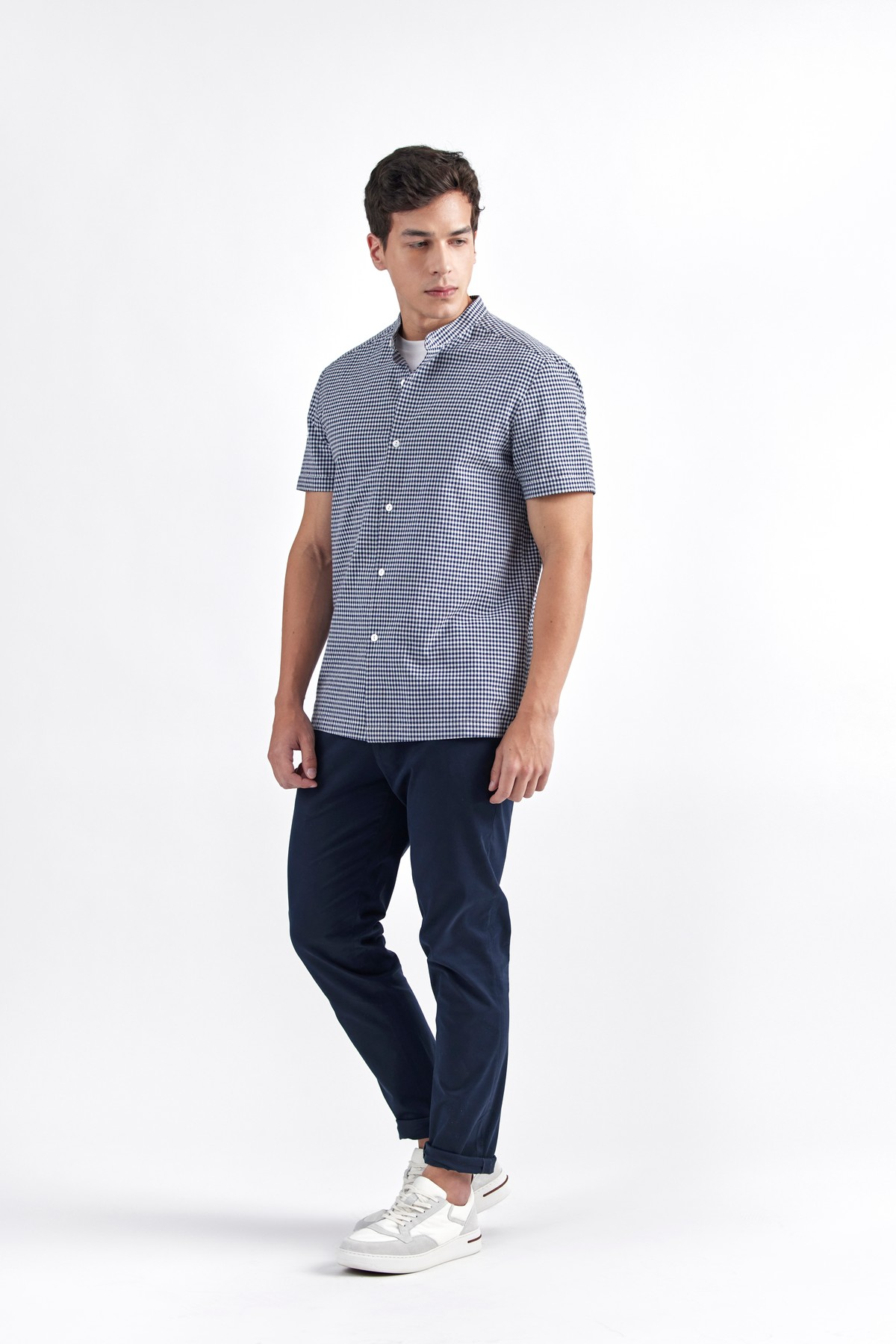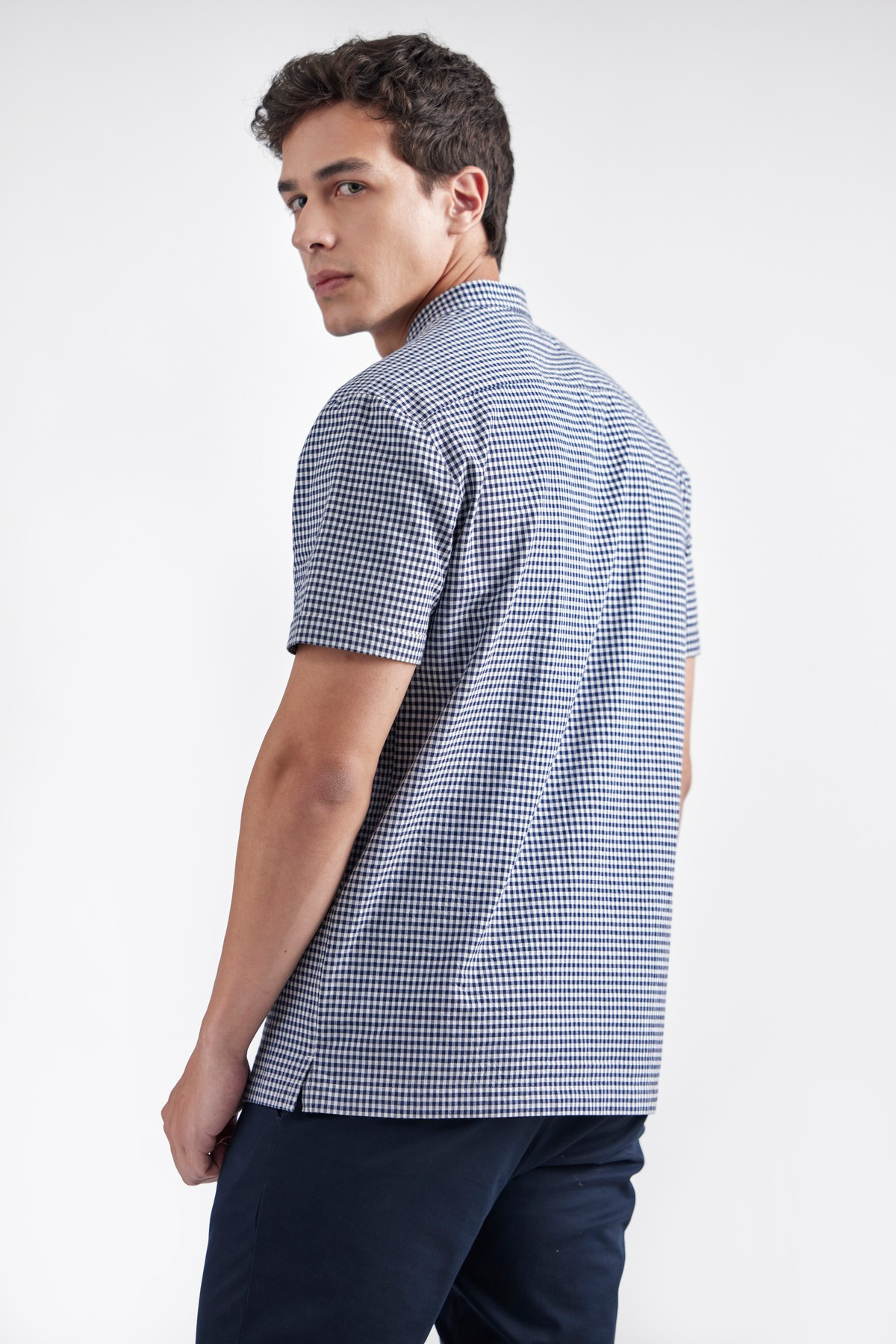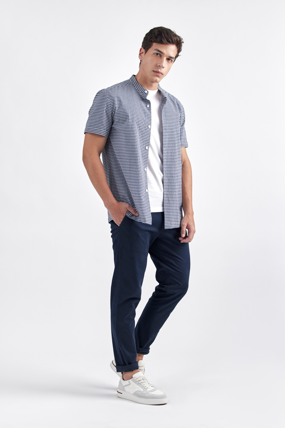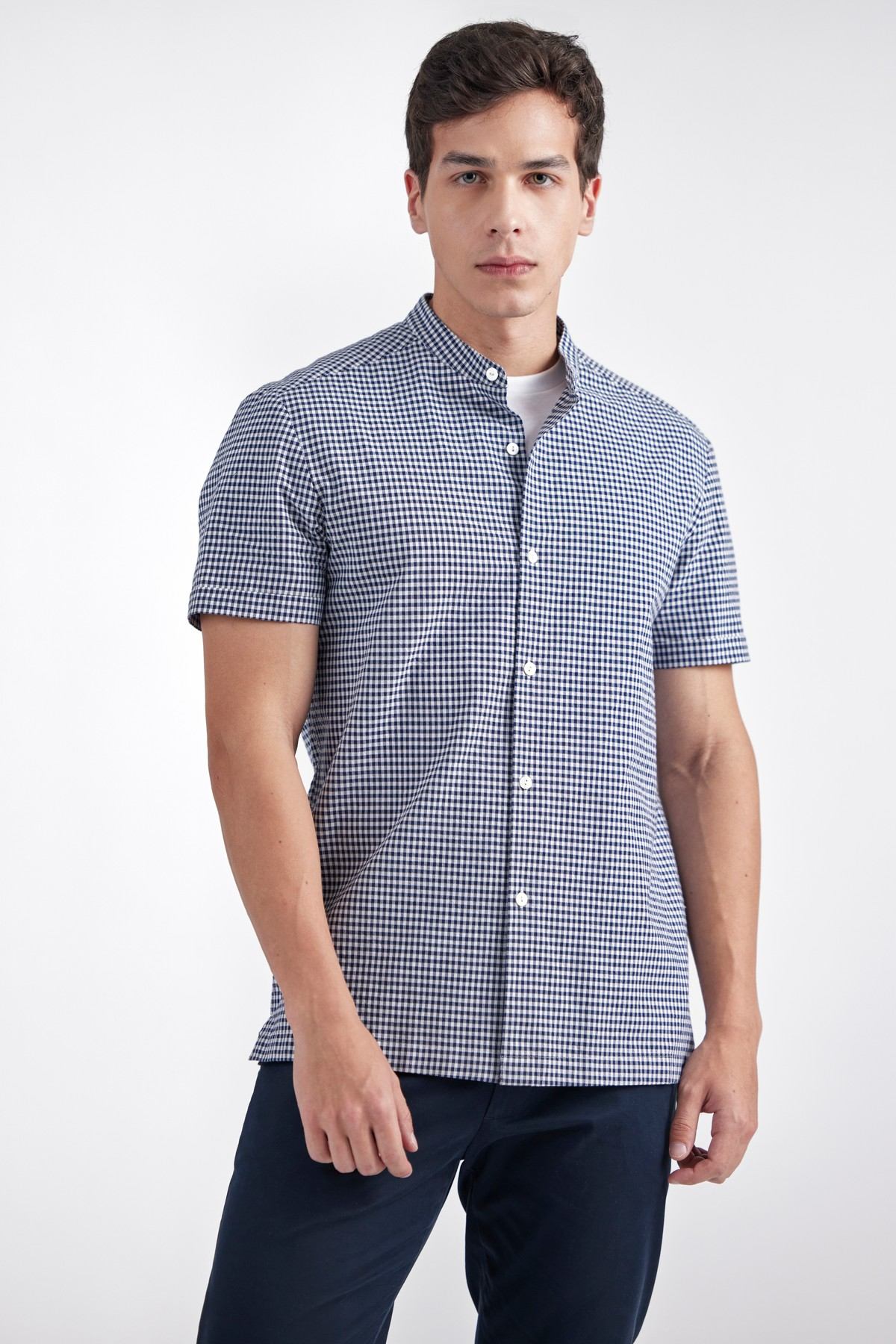 QUAID is designed with a sleek band collar in breathable, lightweight cotton with gingham check which renders ultimate summer comfort. Features band collar, contrast button closure and short sleeves. Relaxed yet close fitting lines to the body through the chest and shoulder add contemporary edge to this iconic essential.