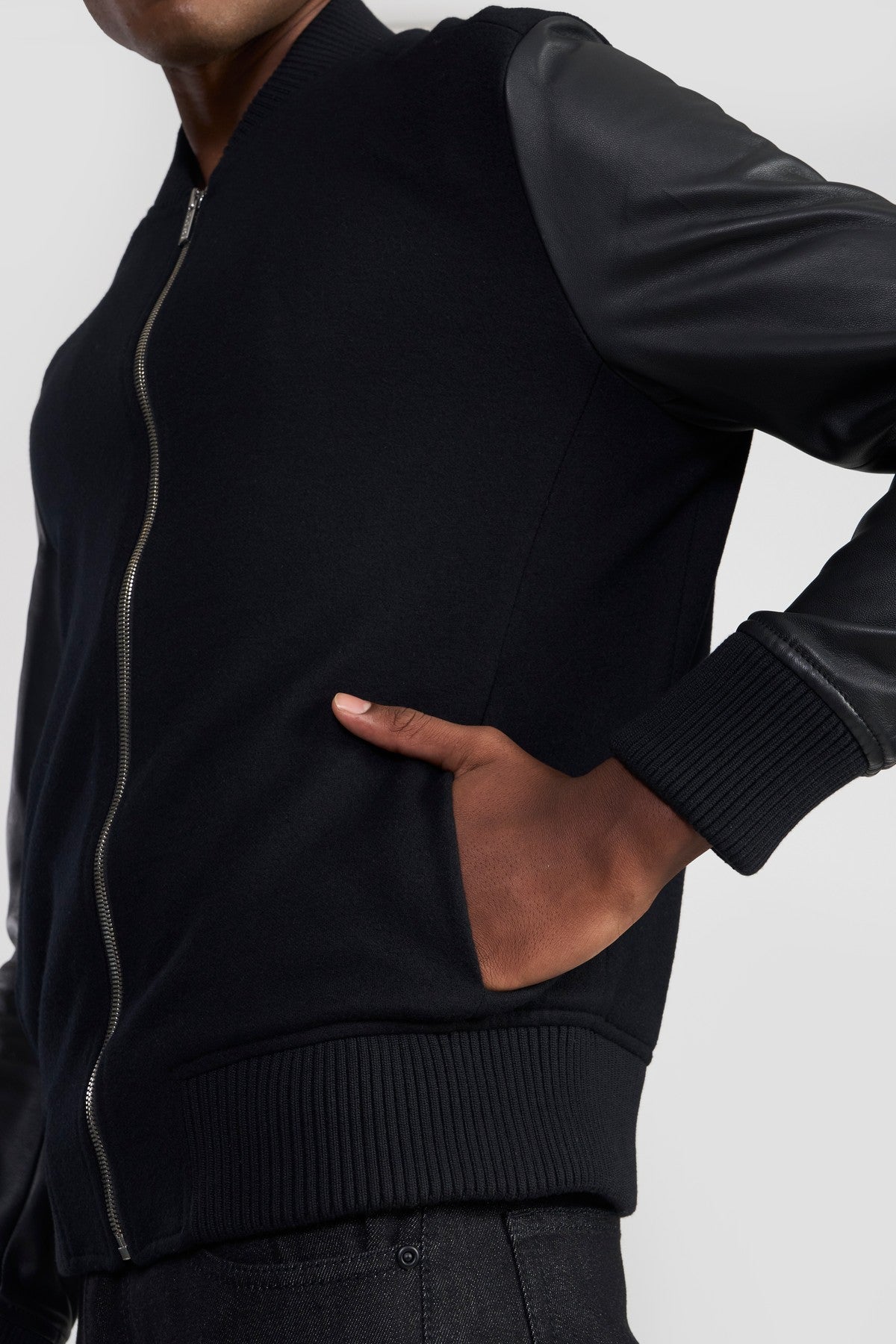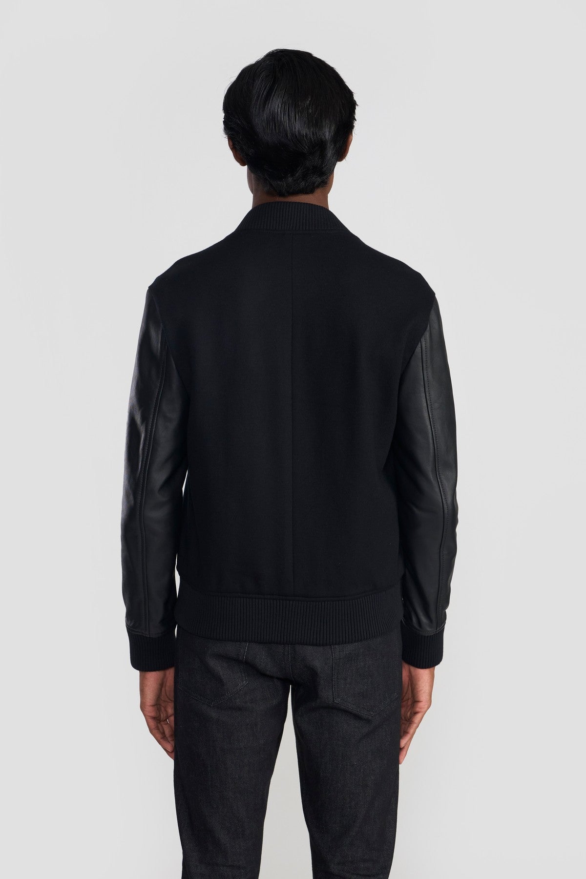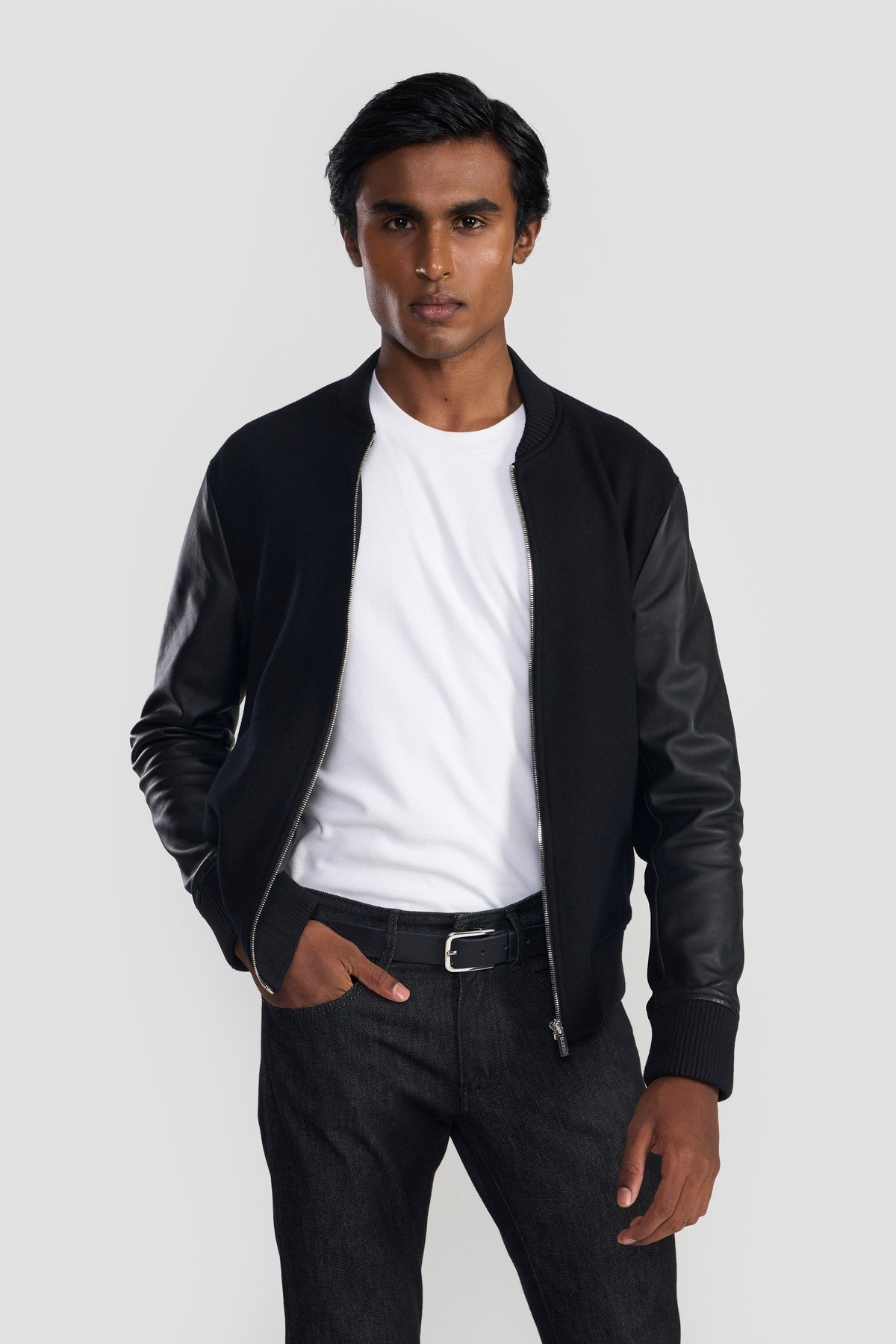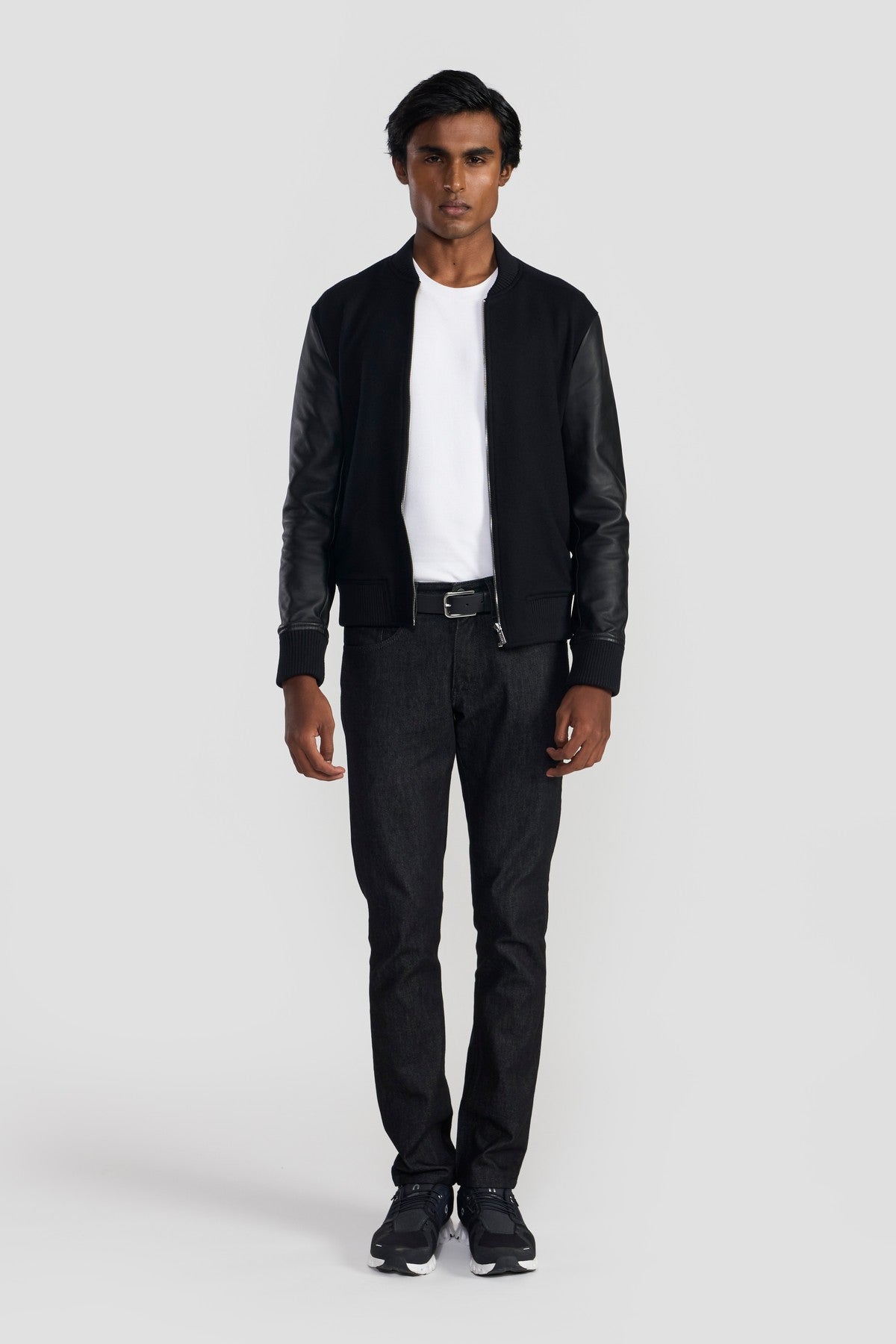 The amalgamation of premium wool blend and LWG certified Nappa leather accents put an elevated spin to to this modern bomber jacket. Lined with technical nylon for extra comfort, it features a finely knitted collar, bottom band, and cuffs, ensuring a regular fit that makes this athleisure piece both comfortable and stylish.