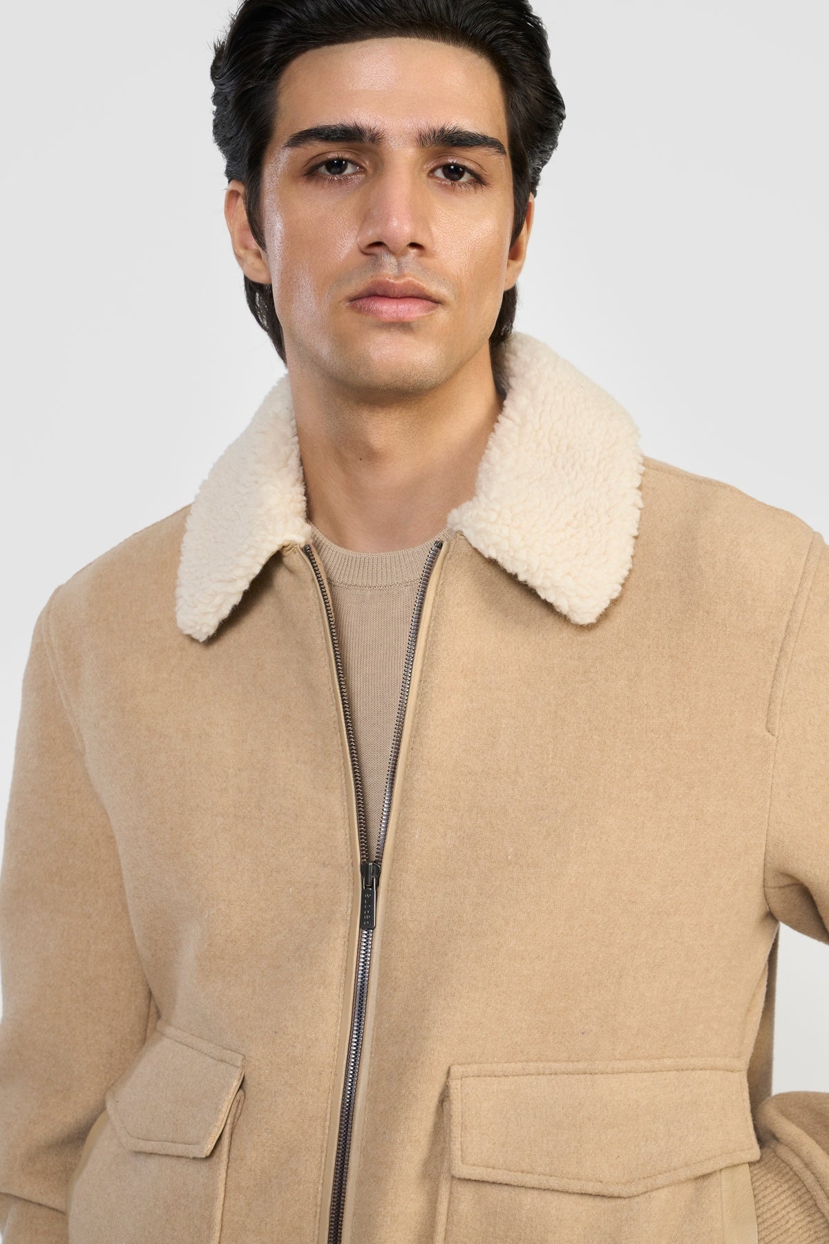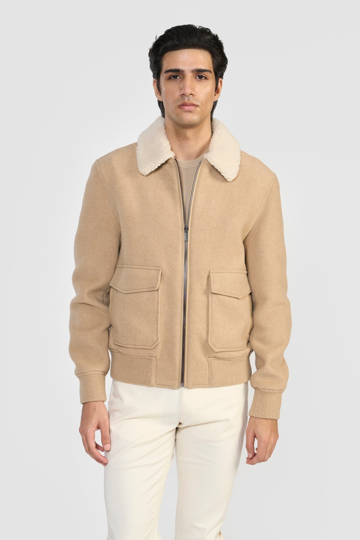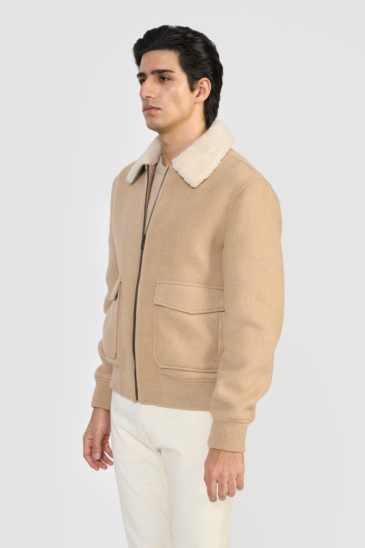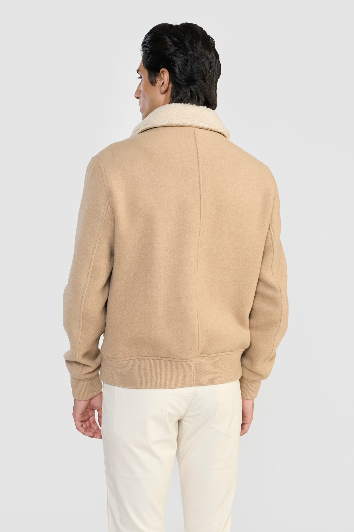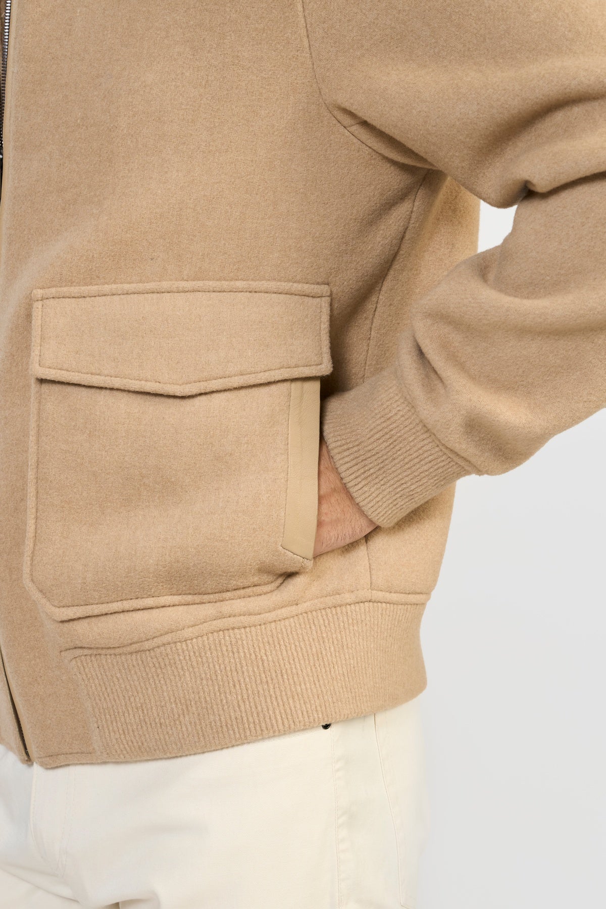 Crafted in luxurious Italian MWool® certified by GRS, this relaxed-fit bomber jacket features LWG-certified leather trims, premium zipper closure, flap pockets, adjustable cuffs, and exclusive wool rib hem. Made from recycled fibers using the Recype® process, it offers vibrant, dye-free colors while minimizing environmental impact. Biodegradable, traceable, and sustainable, MWool® reduces water, energy, and carbon footprint, supporting a circular fashion future.