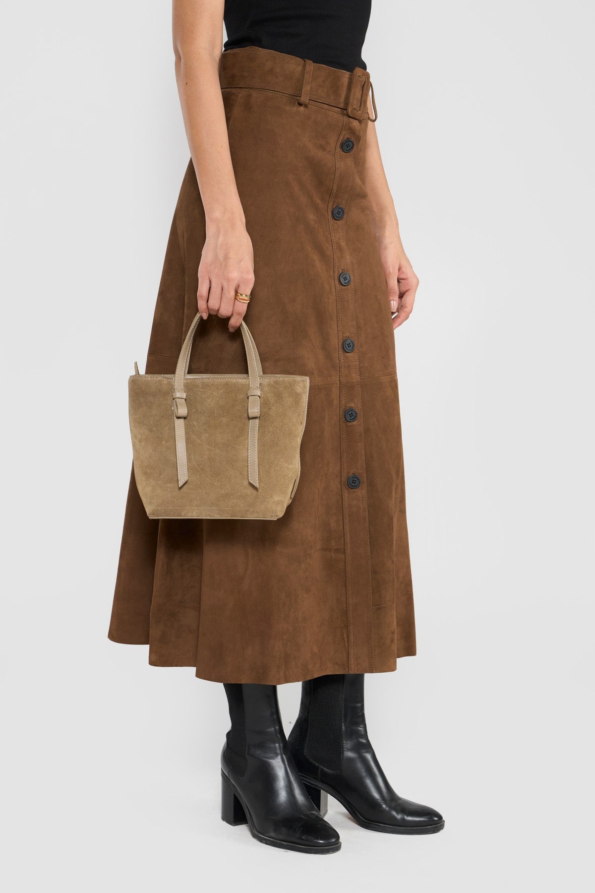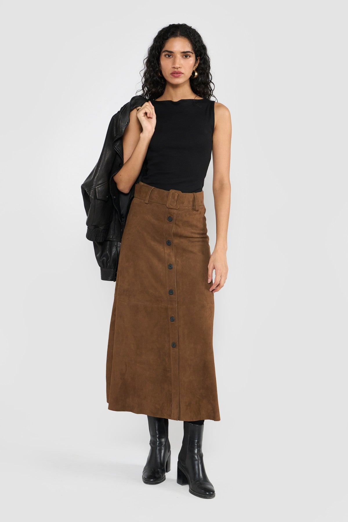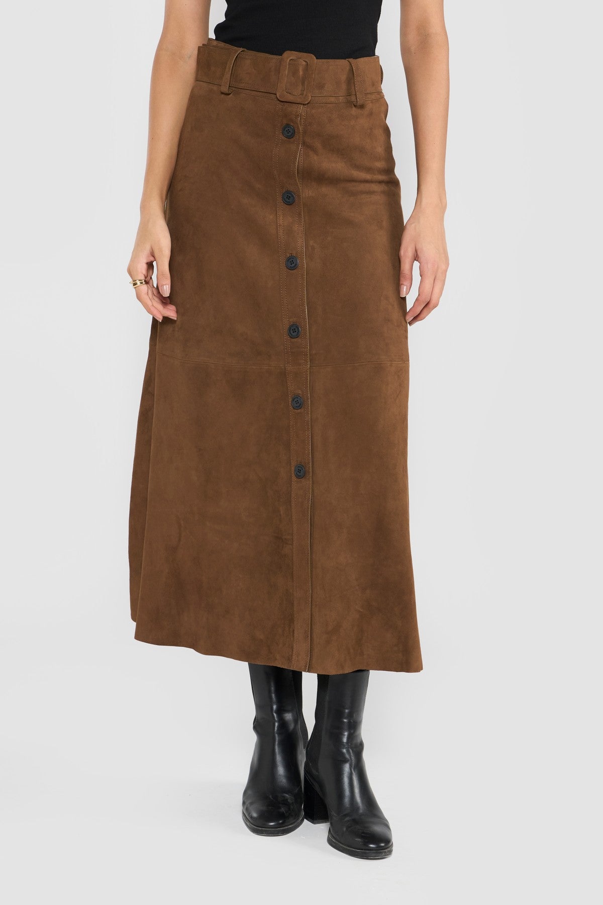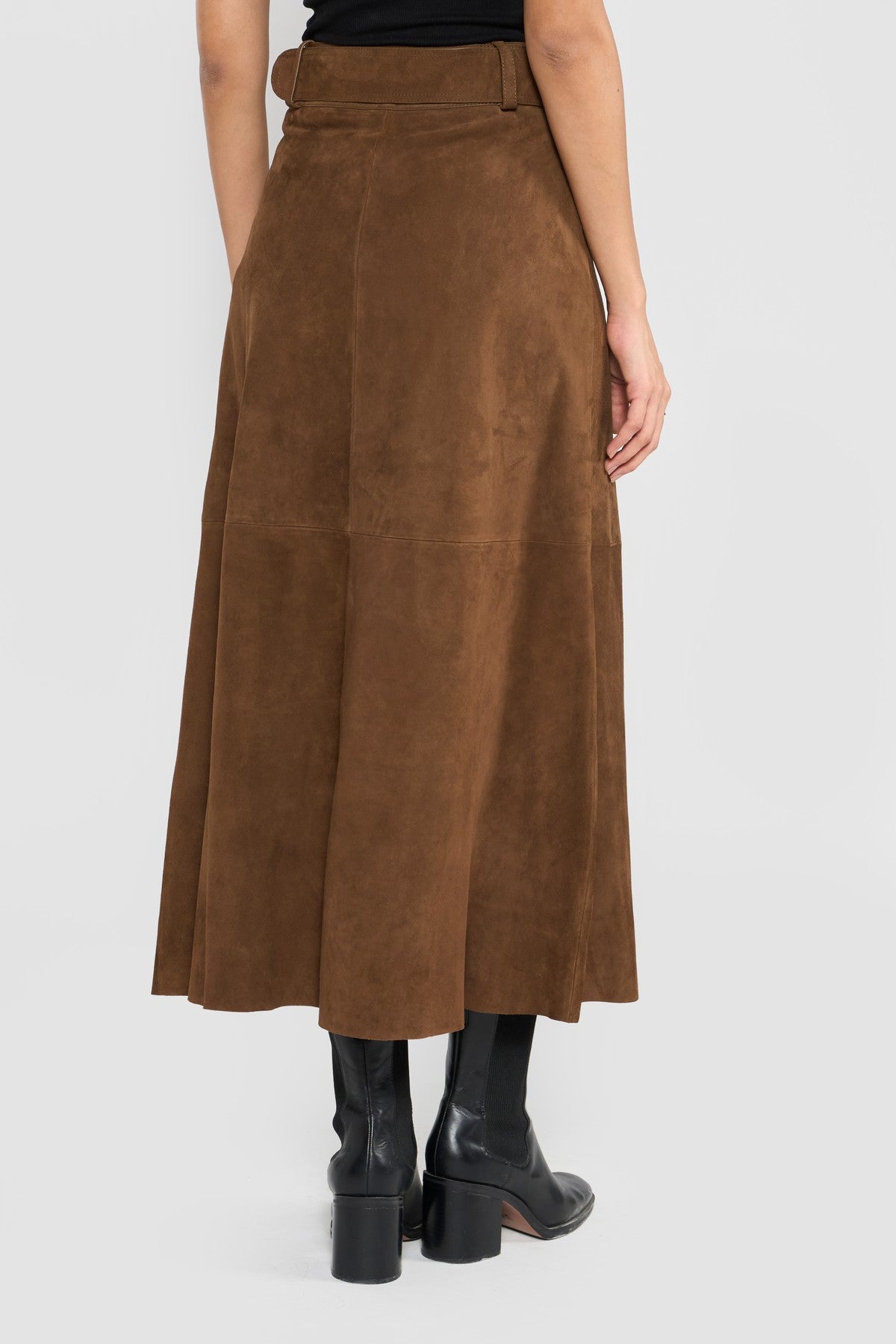 This statement skirt style is accentuated with front button closure, belted waist with leather covered buckle, precious stitch details, elegant A line silhouettes and painted edges. Crafted in LWG certified premium suede leather.