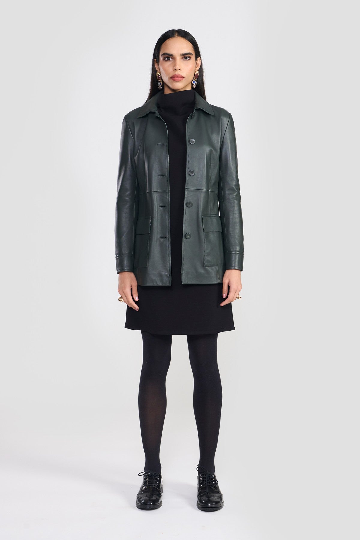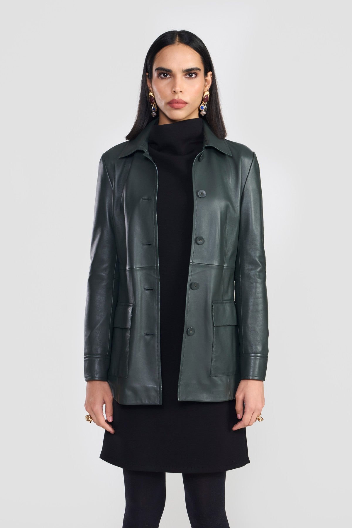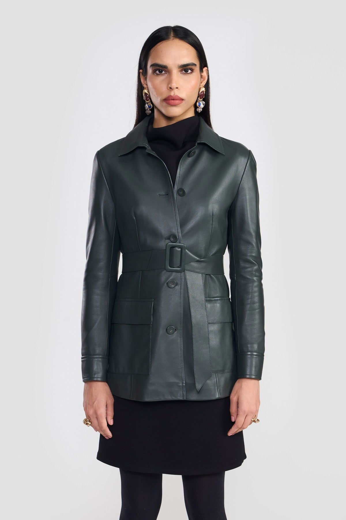 A contemporary essential field jacket detailed with statement stand collar, flap pockets, concealed front zipper closure and adjustable cuff opening. The style is accentuated with a waist belt detailed with decorative stitch and tonal edge paint. Crafted from LWG certified premium nappa leather.