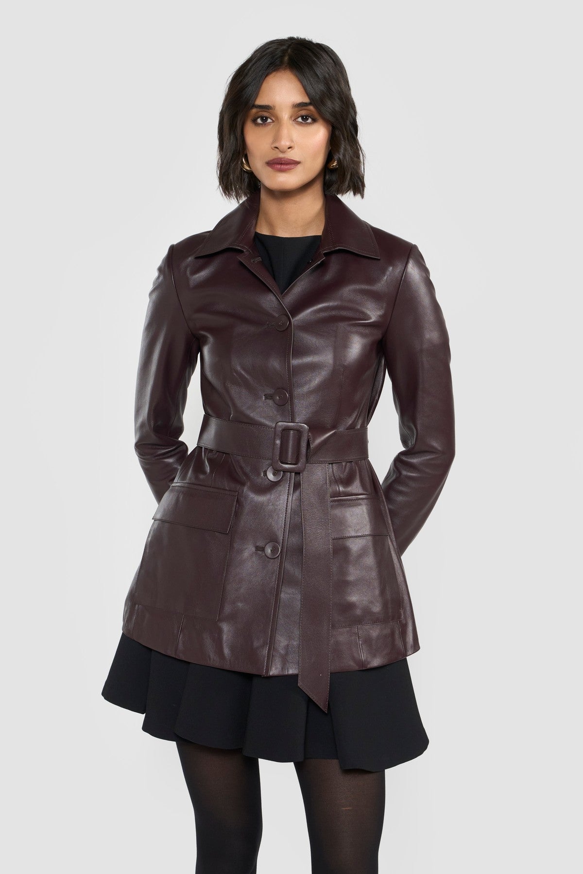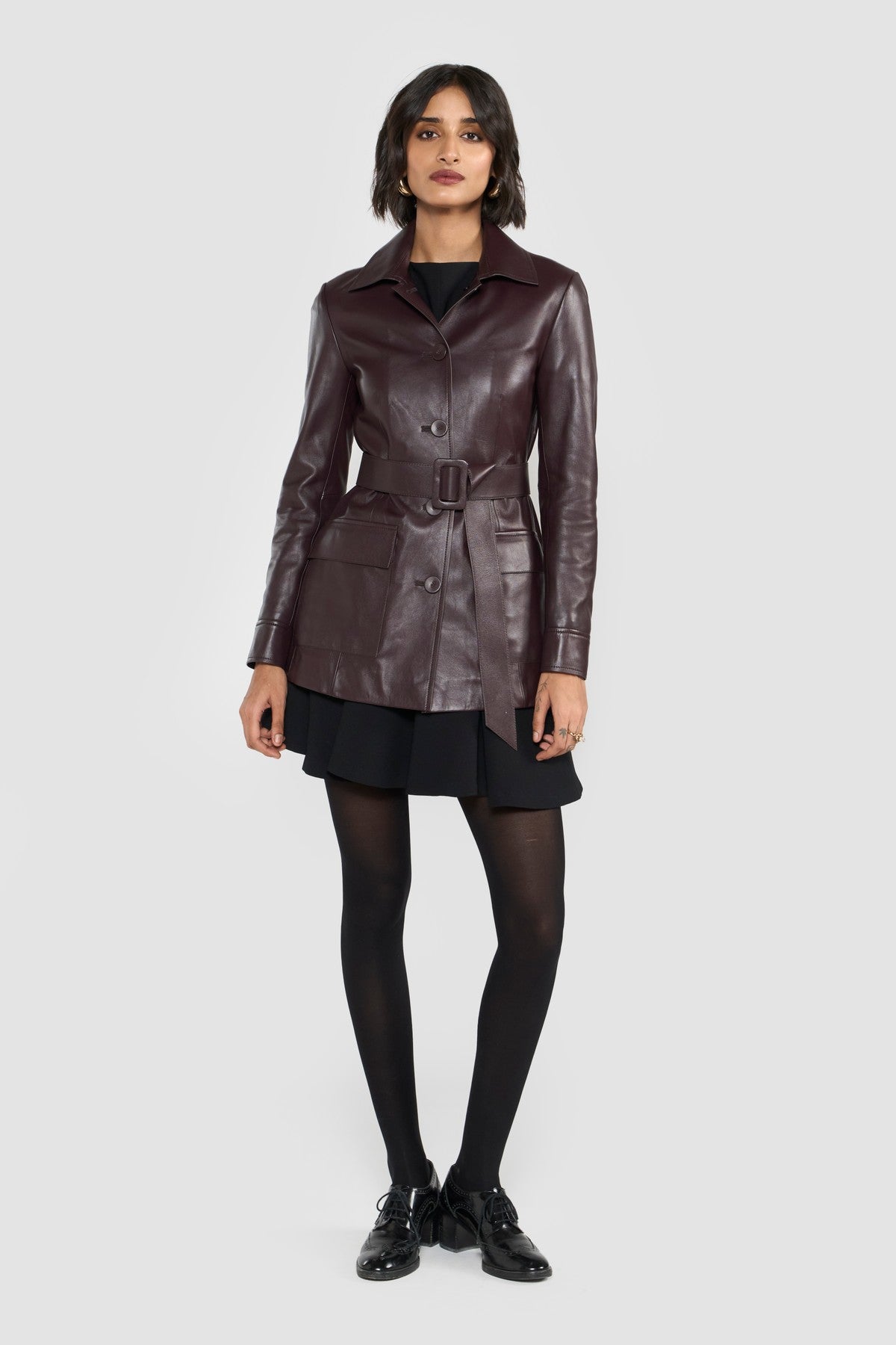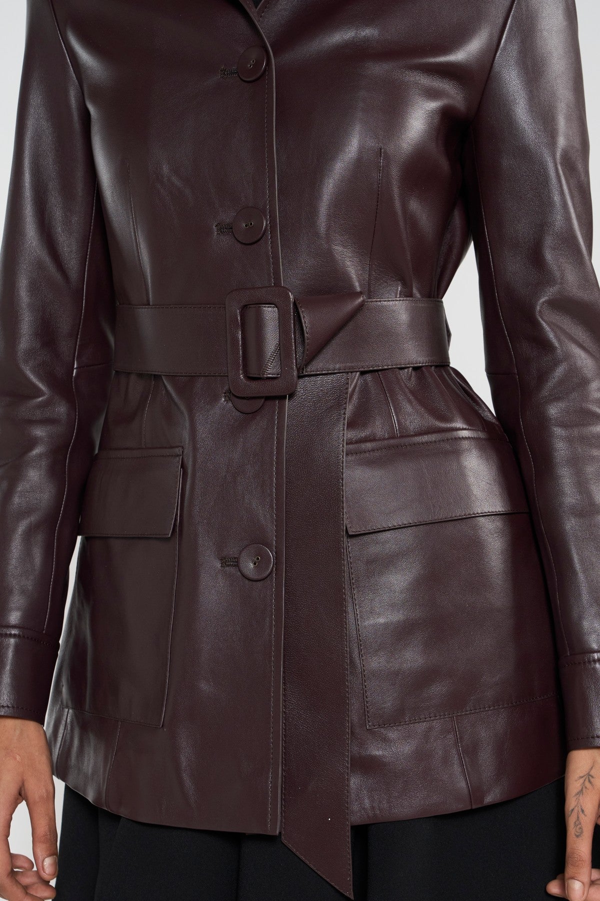 A contemporary essential field jacket detailed with statement stand collar, flap pockets, concealed front zipper closure and adjustable cuff opening. The style is accentuated with a waist belt detailed with decorative stitch and tonal edge paint. Crafted from LWG certified premium nappa leather.