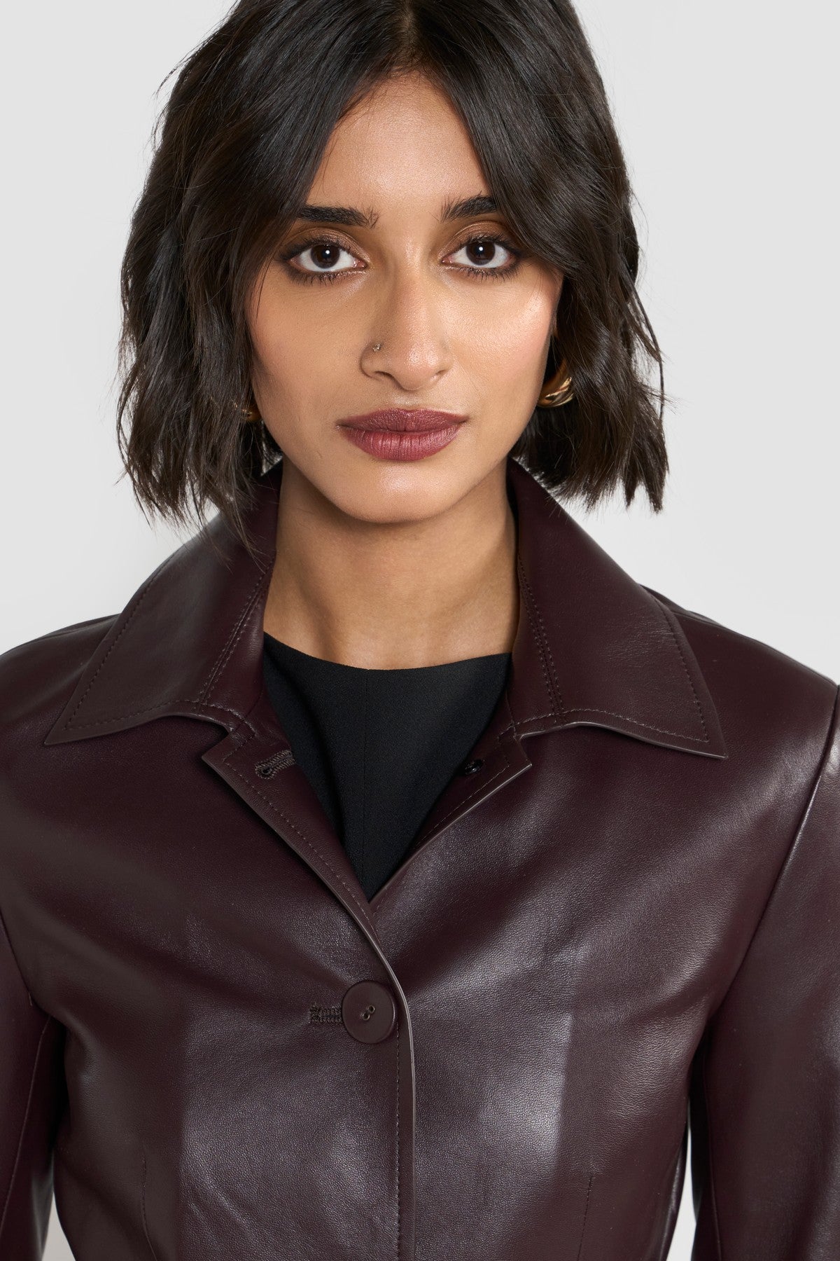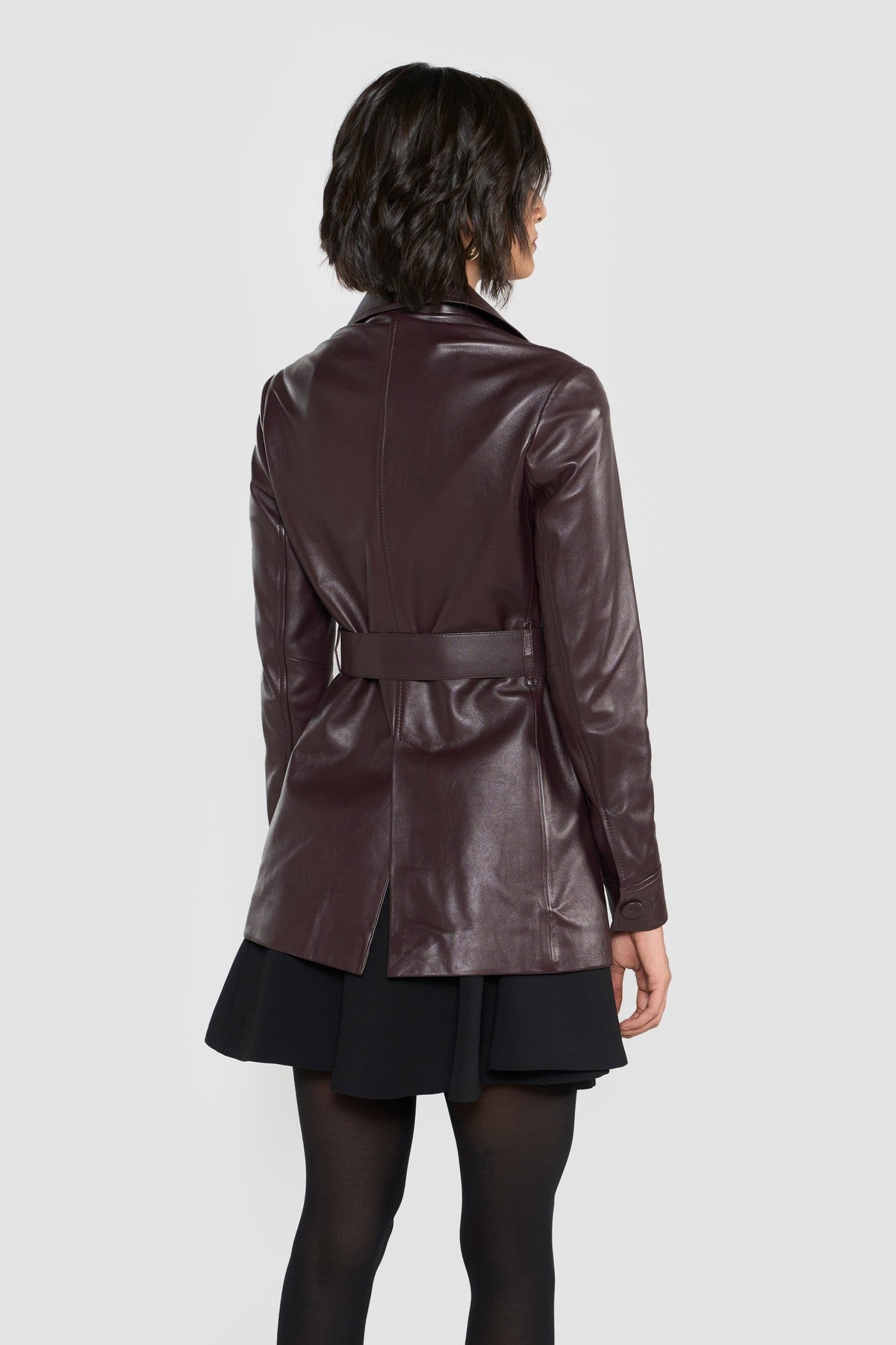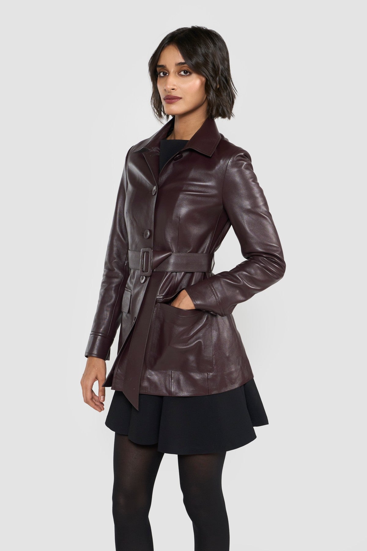A contemporary essential field jacket detailed with statement stand collar, flap pockets, concealed front zipper closure and adjustable cuff opening. The style is accentuated with a waist belt detailed with decorative stitch and tonal edge paint. Crafted from LWG certified premium nappa leather.