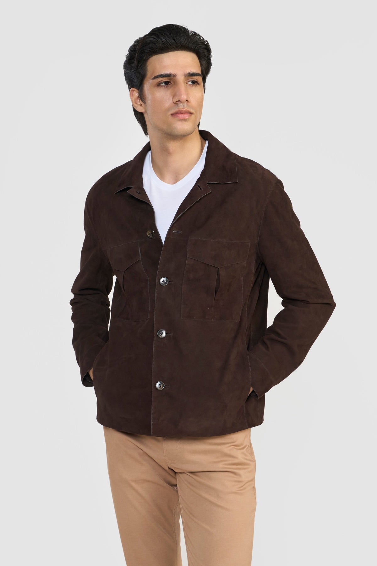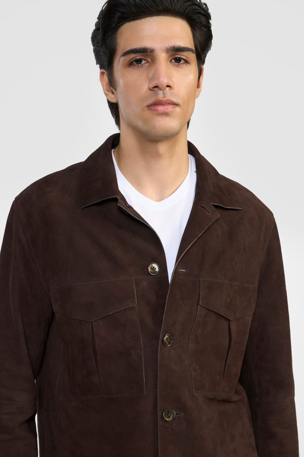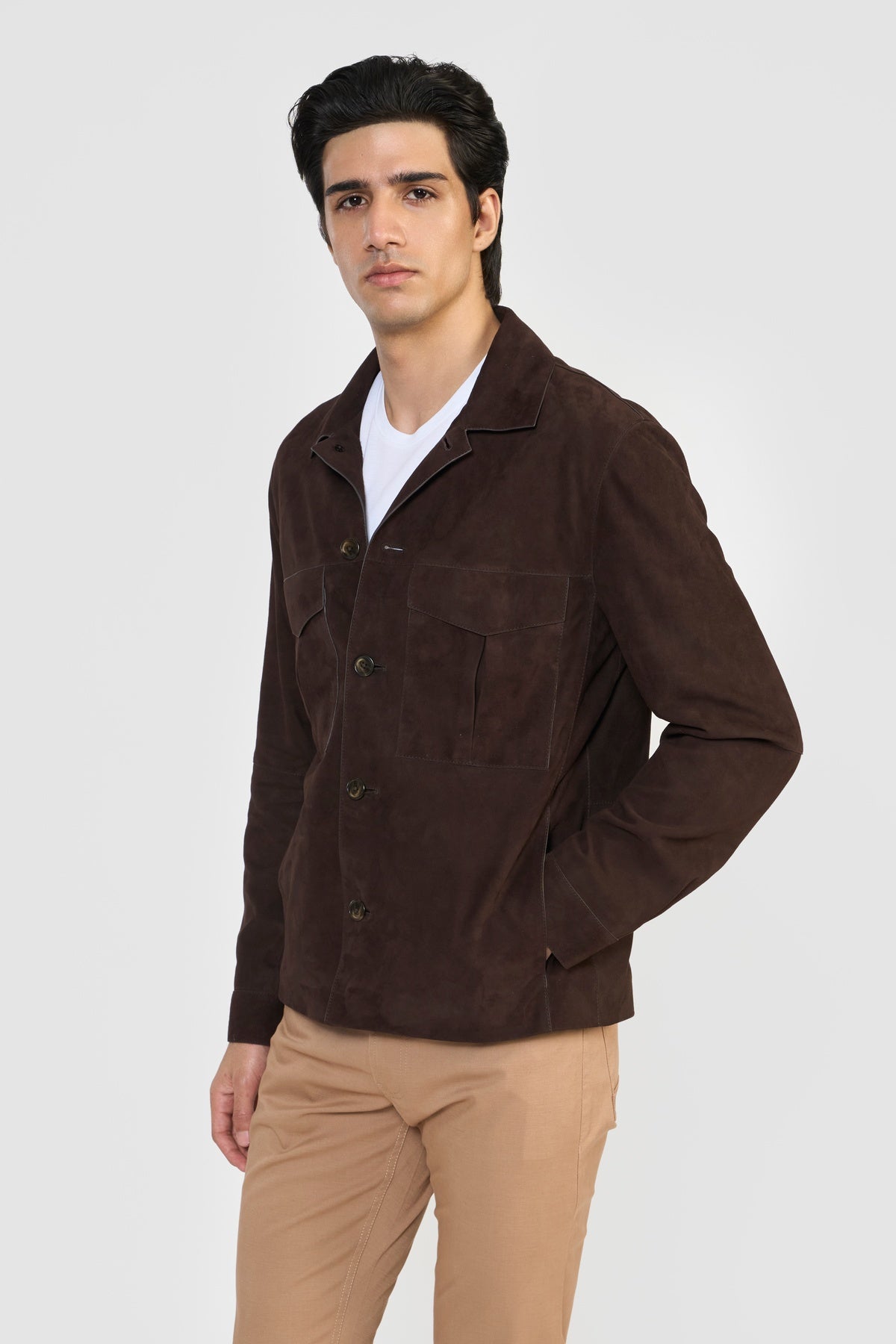 This limited edition leather overshirt is curated in finely etched brown suede leather with defining shirt collar. The statement piece ensures comfortable fit, Perona engraved button closure, chest pocket with flap closure and detailed with edge color, side functional pockets and adjustable cuff opening. Crafted from premium LWG certified suede leather.