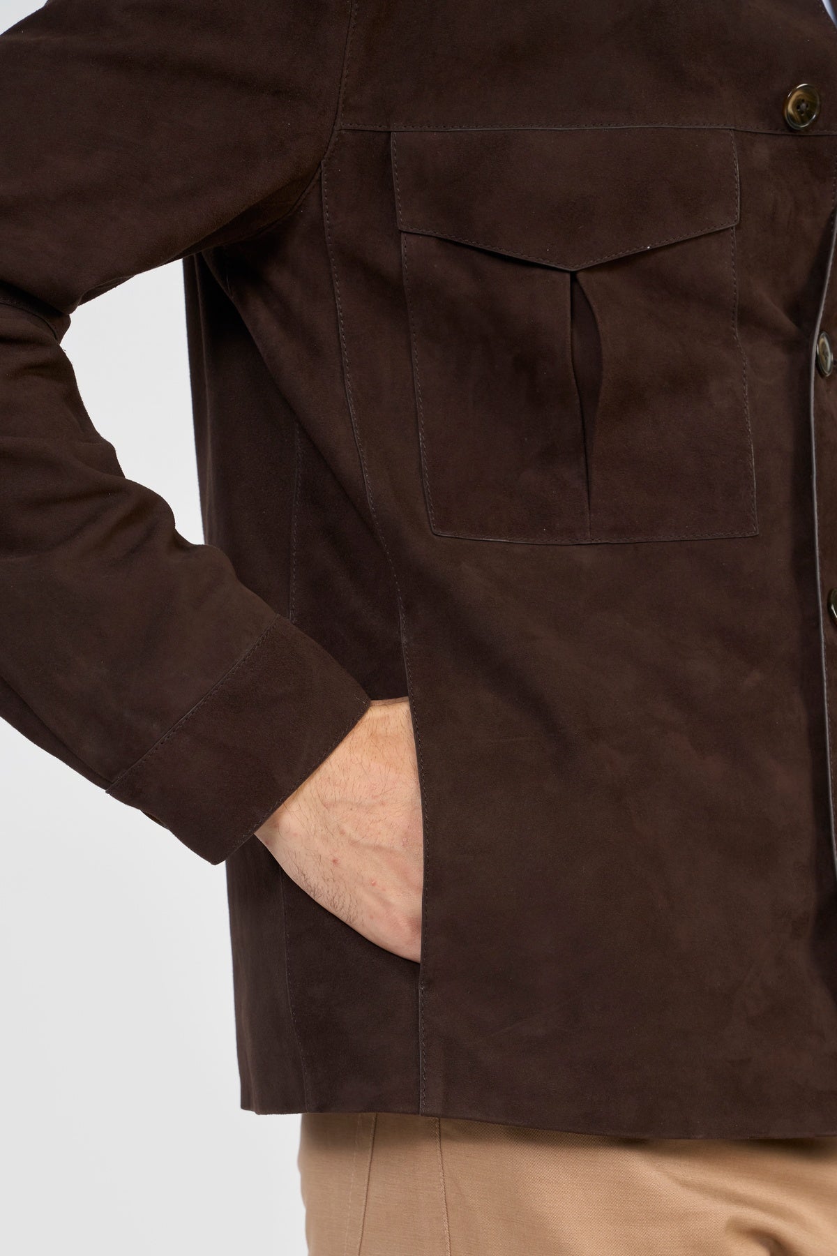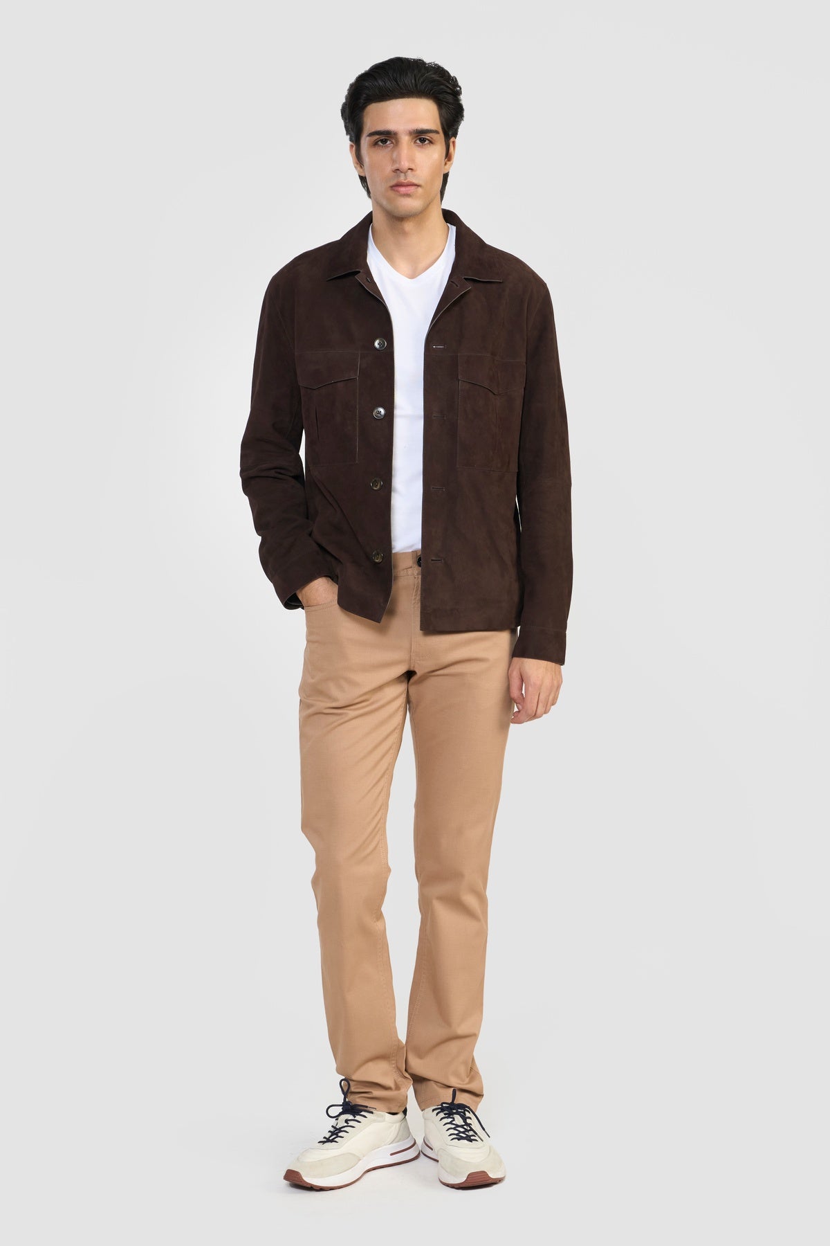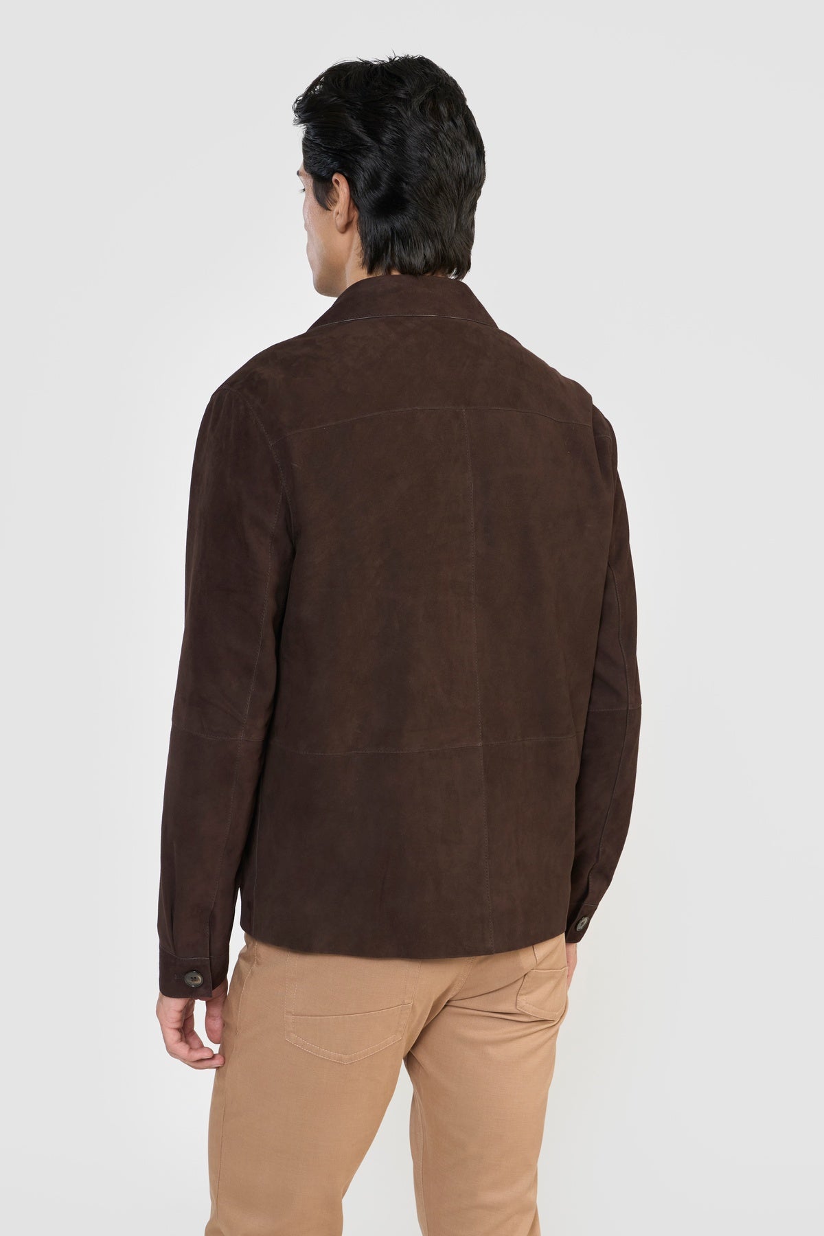 This limited edition leather overshirt is curated in finely etched brown suede leather with defining shirt collar. The statement piece ensures comfortable fit, Perona engraved button closure, chest pocket with flap closure and detailed with edge color, side functional pockets and adjustable cuff opening. Crafted from premium LWG certified suede leather.