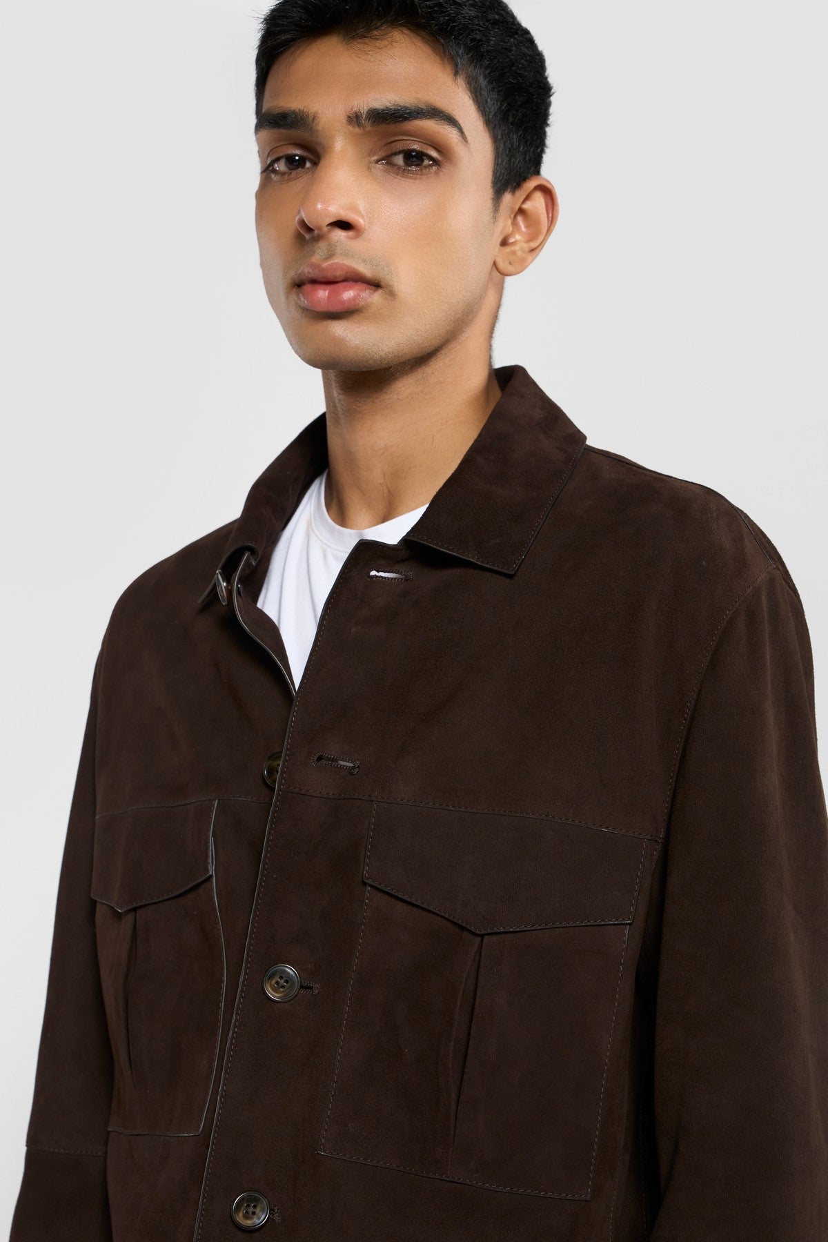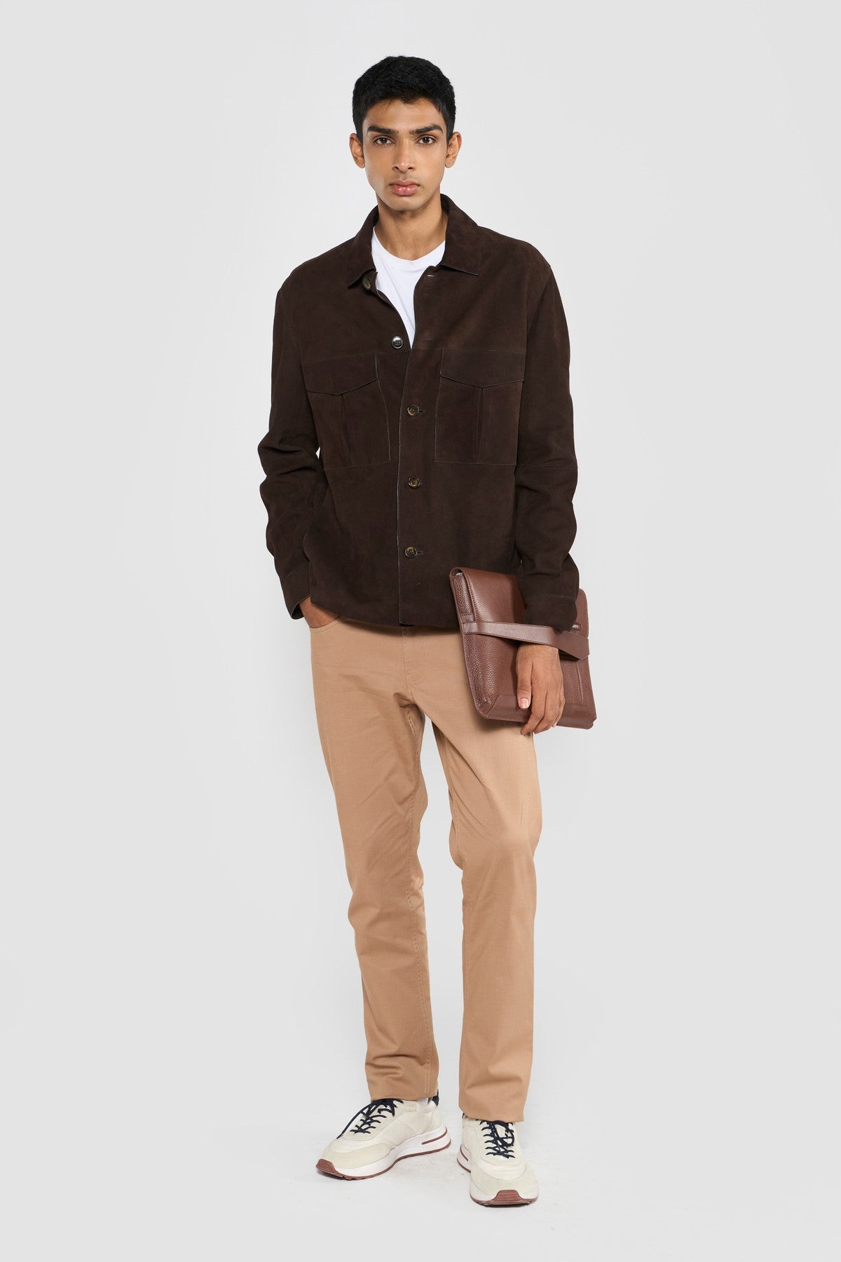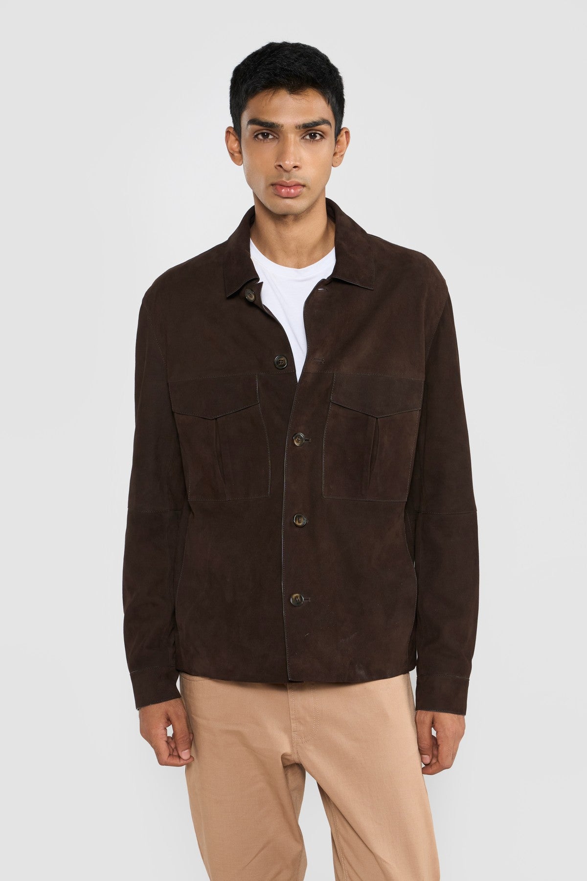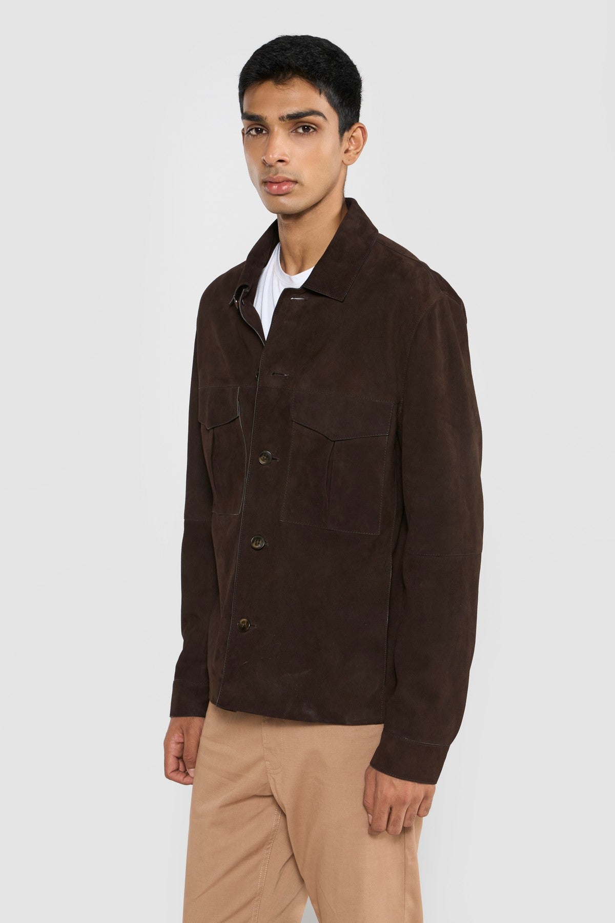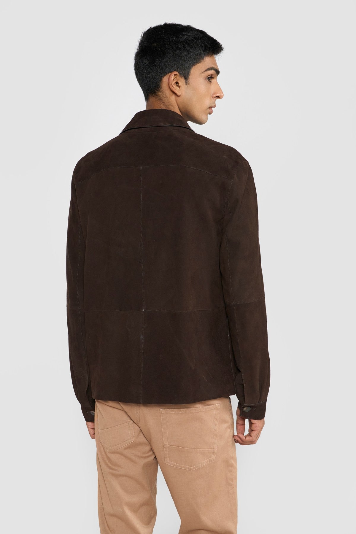 This limited edition leather overshirt is curated in finely etched brown suede leather with defining shirt collar. The statement piece ensures comfortable fit, premium snap button closure, chest pocket with flap closure and detailed with edge color, side functional pockets and adjustable cuff opening. Crafted from LWG certified premium suede leather.