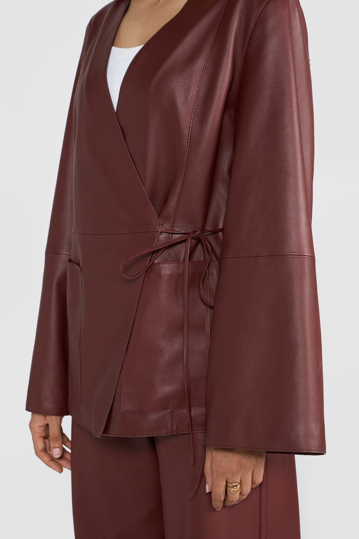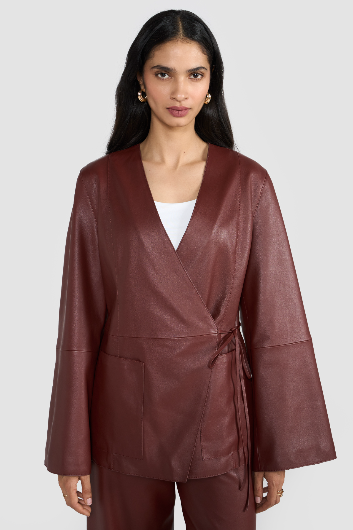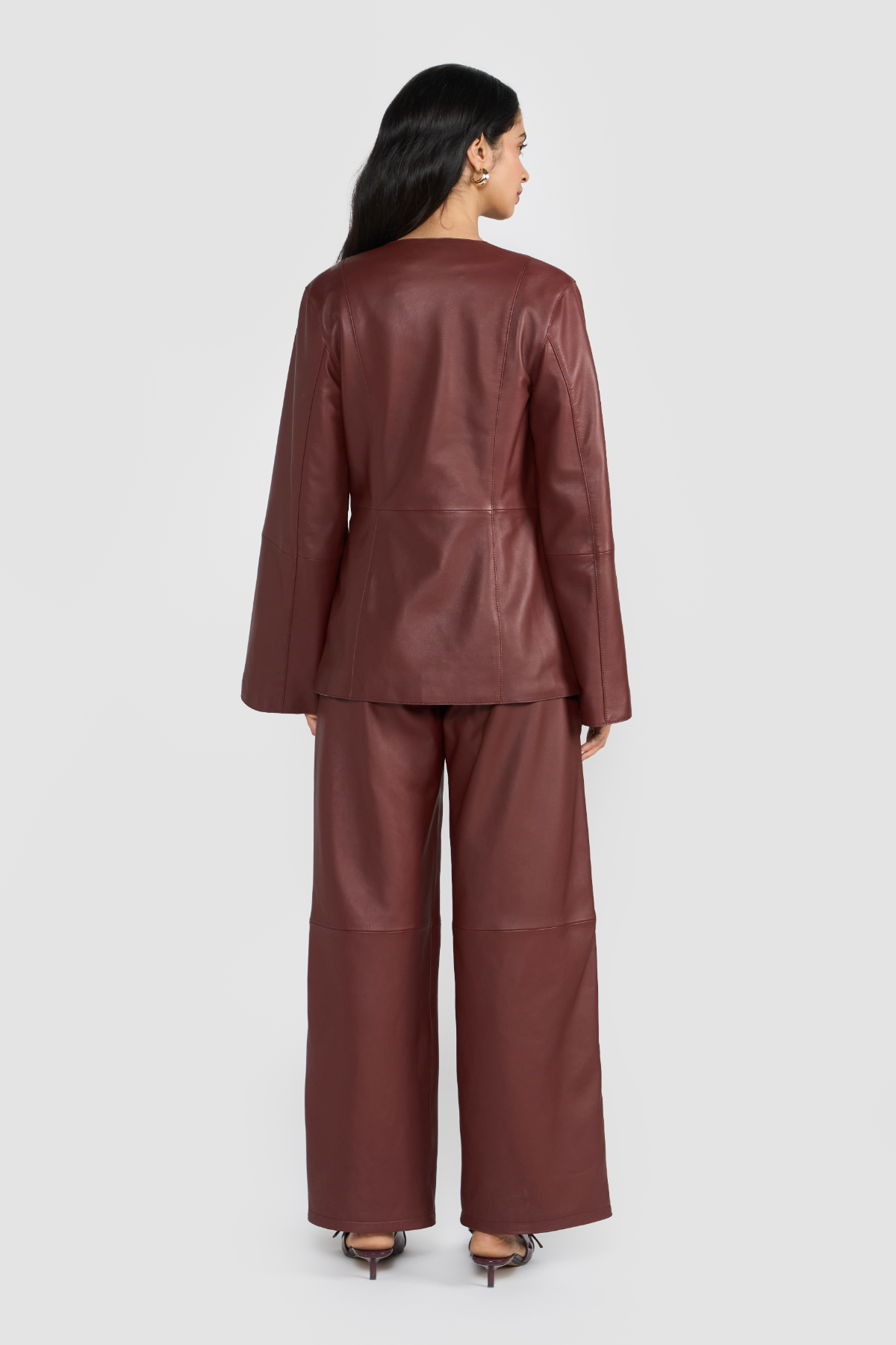 Elevate your wardrobe with this sophisticated collarless blazer, crafted from LWG-certified premium soft supple leather that ensures both luxury and sustainability. The minimalist design highlights clean lines and modern elegance, while the knot tie side closure adds a refined wrap silhouette for a flattering fit.Designed with bell sleeves, this blazer blends timeless tailoring with a contemporary edge, making it a versatile piece for both day-to-night styling. The side closure enhances its sleek profile, offering effortless sophistication and comfort.Pair it with our exclusive ZARIA pants to create a complete, iconic look that transitions seamlessly from day to evening.